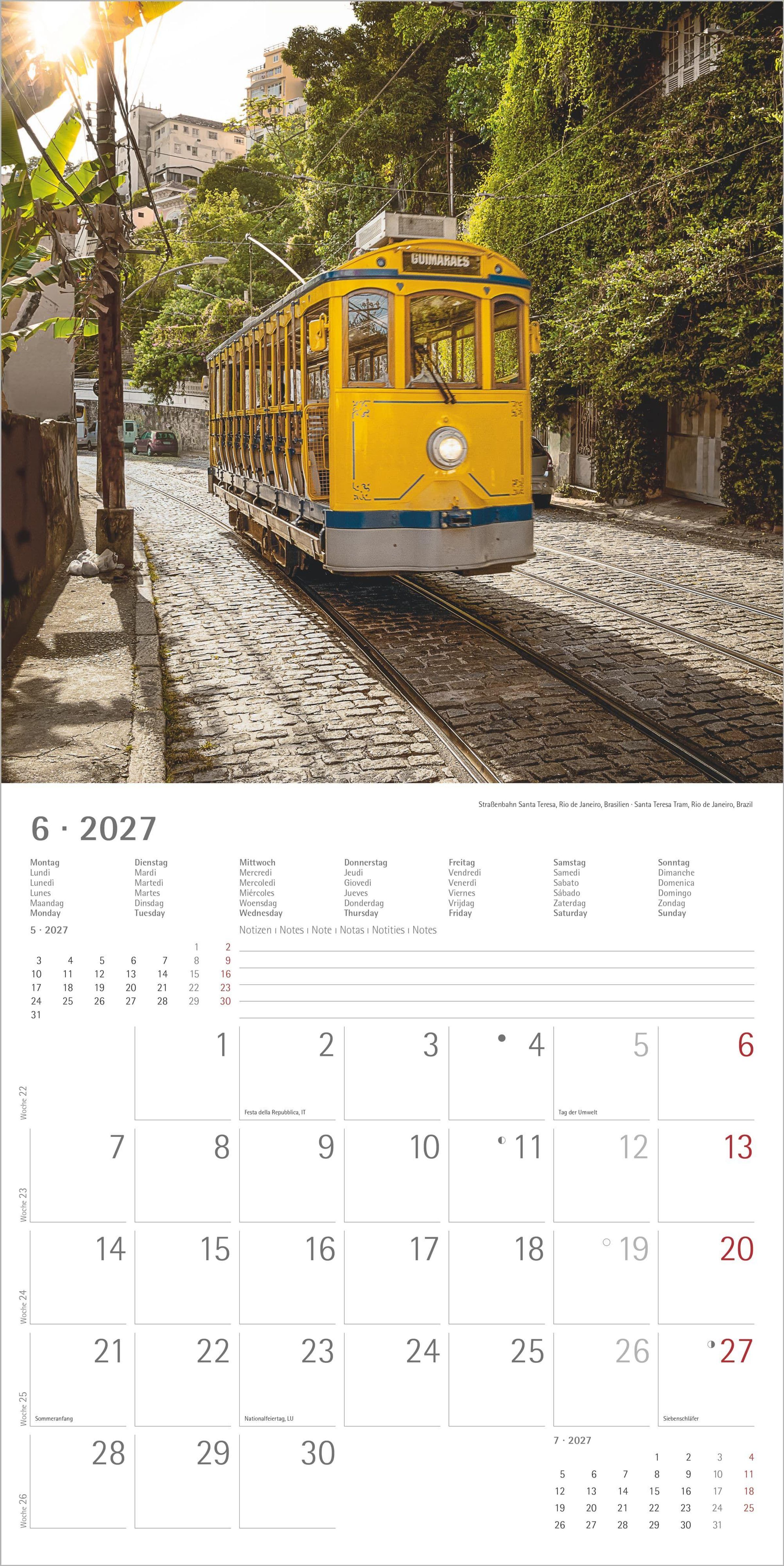 Im großzügigen Format 30 x 30 cm (aufgeklappt 30 x 60 cm) kommen die mächtigen Dampfloks und detailreichen Aufnahmen von Eisenbahnen perfekt zur Geltung. Das übersichtliche, 6-sprachige Kalendarium bietet viel Platz für persönliche Termine und Notizen, zeigt Feiertage vieler Länder und enthält Ferientermine für Deutschland, Österreich und die Schweiz. Zusätzlich finden Sie auf jeder Seite eine Monatsübersicht des Vor- und Folgemonats für eine bequeme Planung.