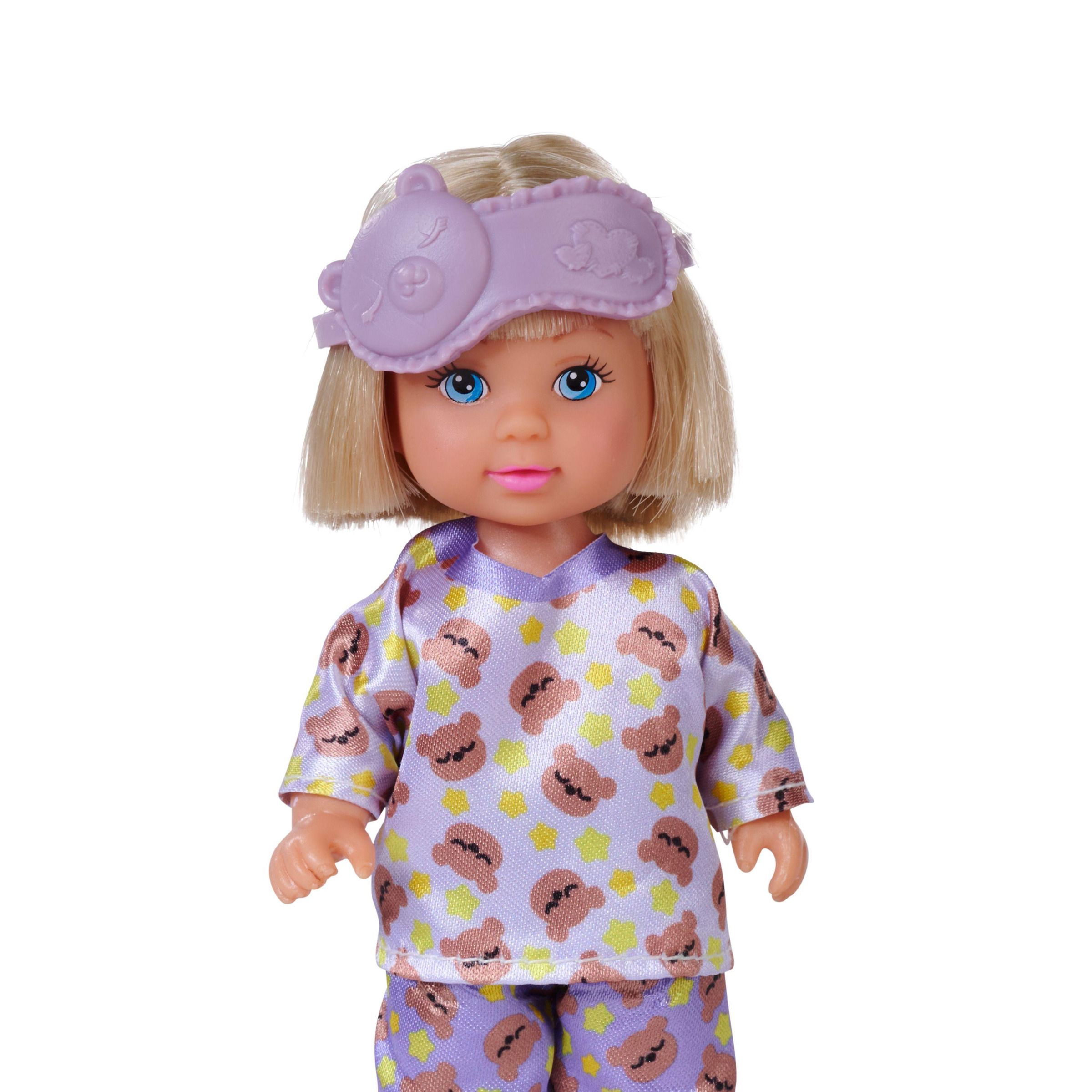 Evi im Schlafanzug mit Schlafmaske, flauschiger Decke, Teddy und Bett mit GID, 12cm, WB, 3J+