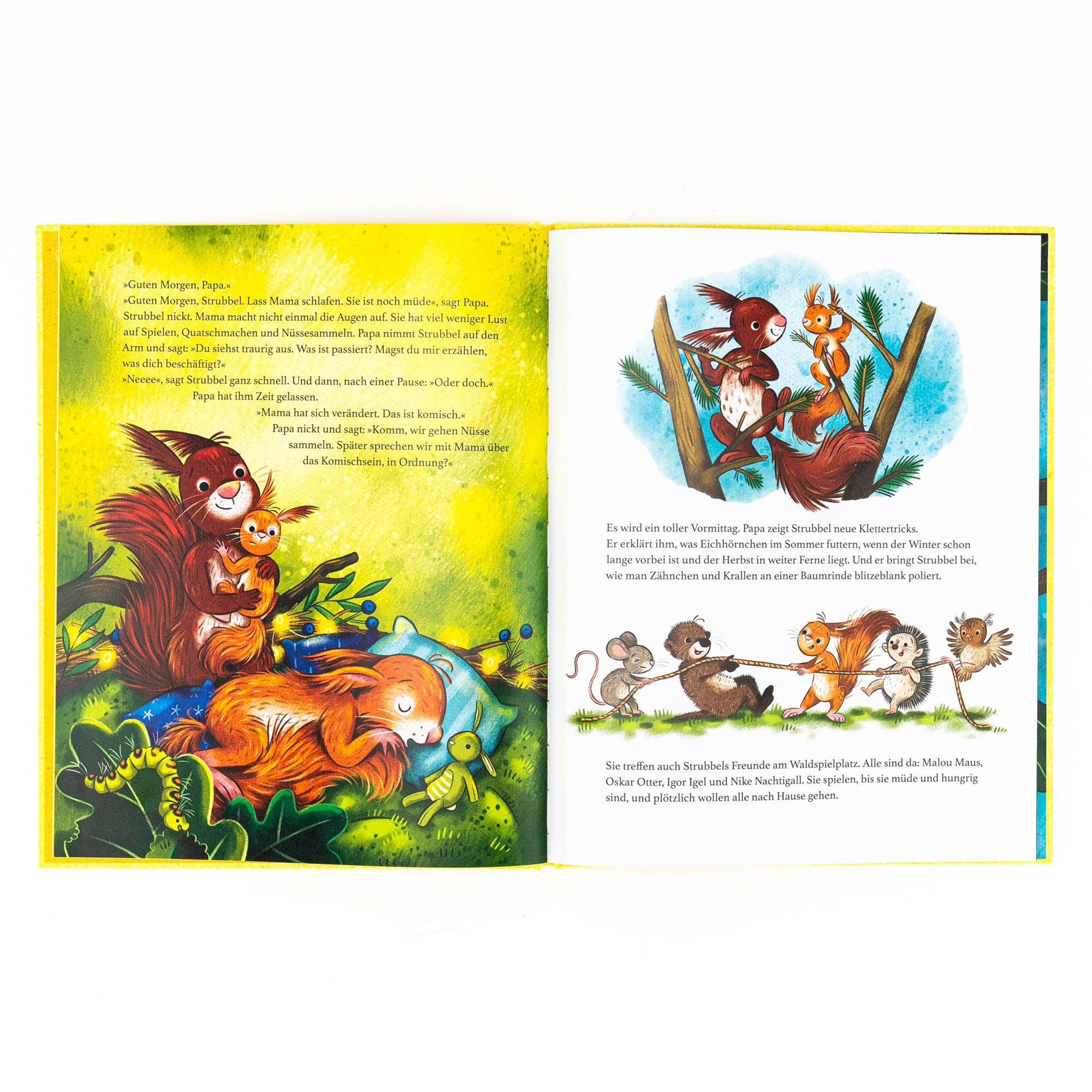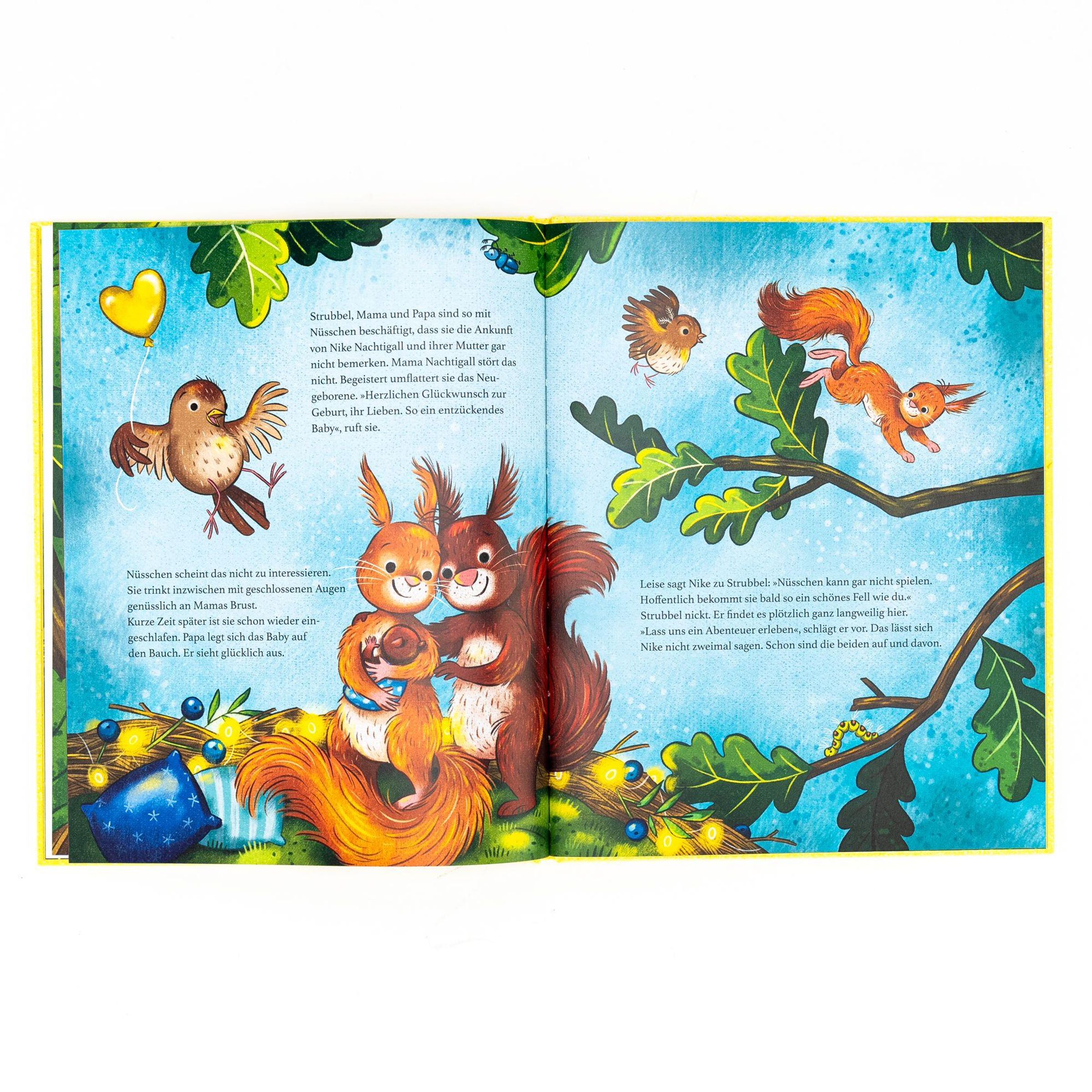 Eines Morgens liegt seine kleine Schwester Nüsschen plötzlich in ihrem Familiennest und Strubbel muss sich an ihr neues Leben zu viert erst einmal gewöhnen. Wieso muss er nun manchmal warten, während sich Mama und Papa um Nüsschen kümmern? Und warum versteht Nüsschen nicht, dass sie ihm sein Spielzeug nicht wegnehmen soll? Doch mit der Zeit lernt Strubbel, wie es ist Geschwister zu haben. Dass man sich mit ihnen streiten darf oder es eben sein lässt. Dass man zusammen viel Quatsch machen kann. Und vor allem, dass Mama und Papa ihn immer lieb haben werden und zwar kein klitzekleines Stückchen weniger als vorher.