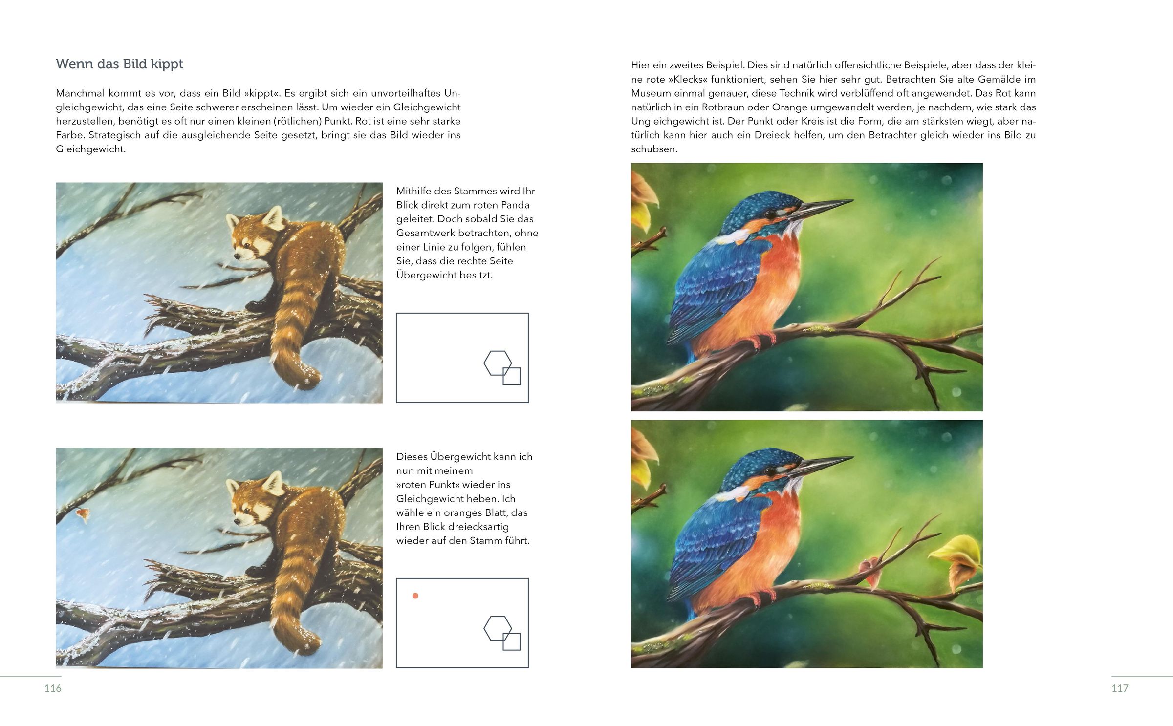 Fluchtpunkt und Perspektive sind verstanden, jetzt geht es um die Gesamtkomposition des Bilds: In einem extra Kapitel zeigt Autorin Elisabeth Poniz in mehreren Schritten, wie man ein perspektivisch korrekt dargestelltes Motiv ins Gesamtbild integriert. Sie zeigt, wie die Wahl des Formats einen Einfluss auf die Aussage des Bilds haben kann, welche Wirkung Farben erzielen und worauf man achten muss, wenn auf einem Bild viel los ist.