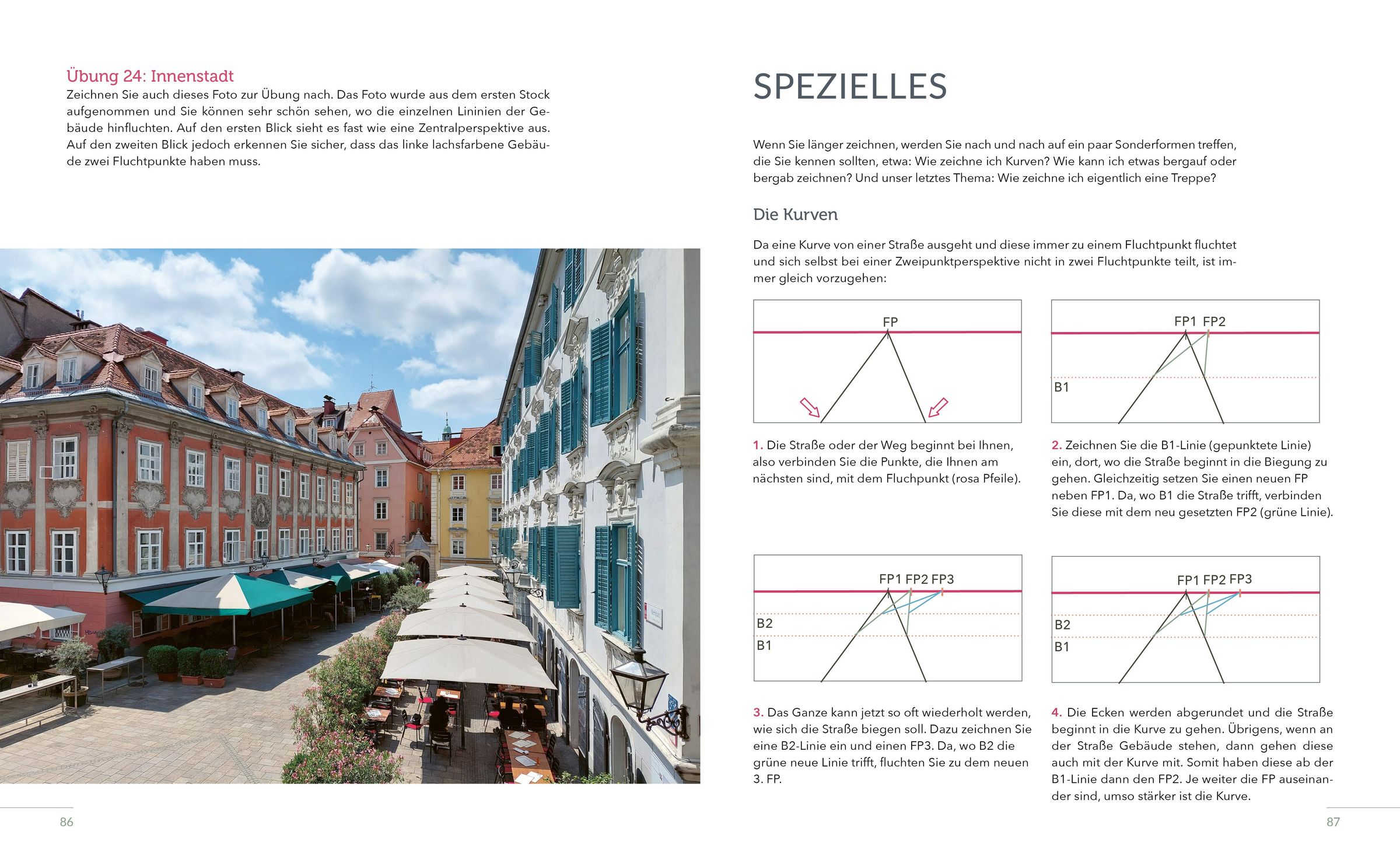 Korrektes räumliches Zeichnen spielt eine sehr große Rolle beim Zeichnen lernen. Für Anfänger geht es dabei meist erst einmal darum zu verstehen, welche Perspektiven es gibt und auf welche Weisen man den Fluchtpunkt zeichnen kann. Aber auch Fortgeschrittene können von einer kontinuierlichen Beschäftigung mit Thema profitieren. Mit zahlreichen Fotoanalysen hilft dieses Buch dabei: Die klassische Übung >>Stuhl zeichnen mit Perspektive<< wird beispielsweise anhand zahlreicher Fotos analysiert, mit Bildern von realen Umgebungen in Stadt und Land wird das perspektivische Sehen weiter geschult.
