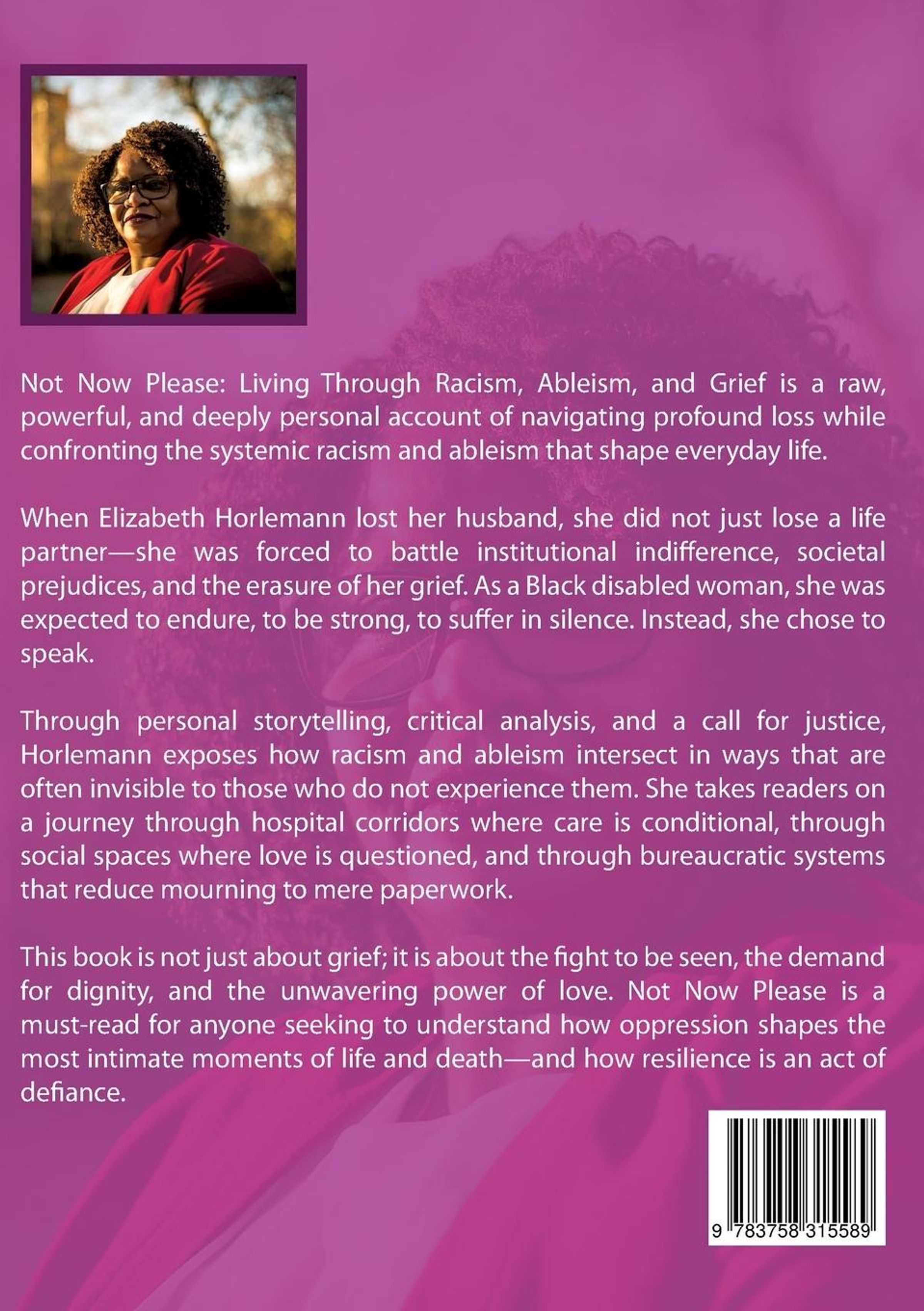 In "Not Now Please: Living through Racism, Ableism, and Grief," Elizabeth takes you on an intimate journey through the intersecting worlds of adversity, resilience, and transformation. This compelling narrative is a candid exploration of personal experiences that touch upon the deep-rooted issues of racism, ableism, and the complexities of grief.