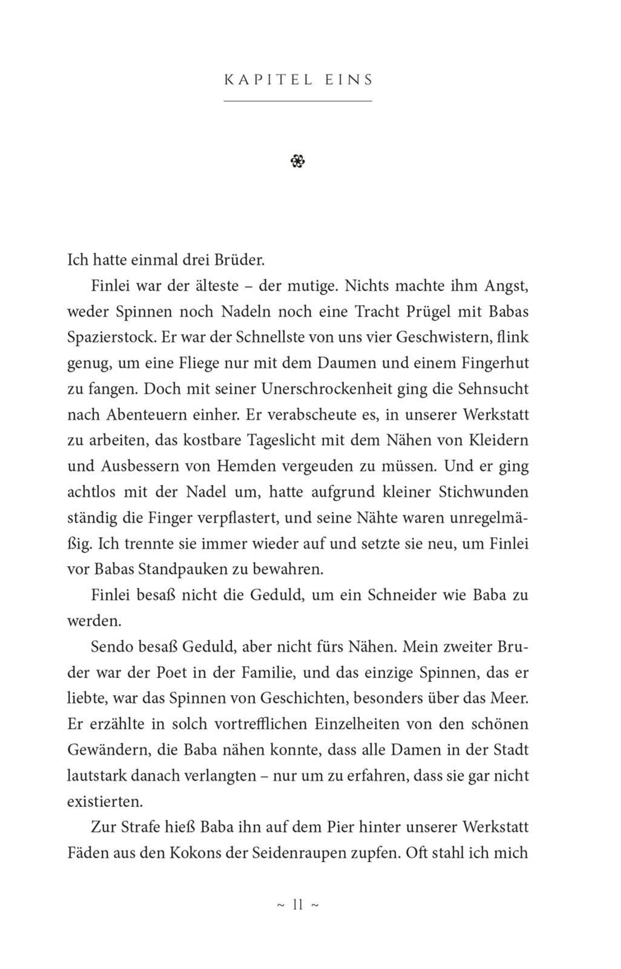 Maia Tamarin träumt davon, die beste Schneiderin des Reiches zu werden. Sie lernt diese Kunst von ihrem Vater und ist sehr begabt, aber als Mädchen ist ihr die Ausübung dieses Berufes untersagt. Als der Kaiser einen Wettbewerb um den Posten des Hofschneiders ausruft, fasst sie einen gewagten Plan: Verkleidet als Junge reist sie unter dem Namen ihres Bruders an den Hof, um für ihren Traum zu kämpfen. Unter den zwölf Schneidern, die sich bewerben, herrscht hohe Konkurrenz, das Leben am Hof ist von Intrigen bestimmt - und keiner darf Maias Geheimnis erfahren, denn dann erwartet sie der Tod. Doch schon bald zieht sie die Aufmerksamkeit des geheimnisvollen Magiers Edan auf sich: Er scheint ihre Verkleidung zu durchschauen. Und Maia braucht seine Hilfe, um die schier unmögliche letzte Aufgabe des Wettbewerbs zu erfüllen: Sie muss drei magische Kleider für die kaiserliche Prinzessin nähen, die aus Elementen der Sonne, der Sterne und des Mondes gewirkt sind. Zusammen mit Edan begibt sich Maia auf eine gefährliche Reise, die sie fast alles kostet, was ihr lieb und teuer ist.