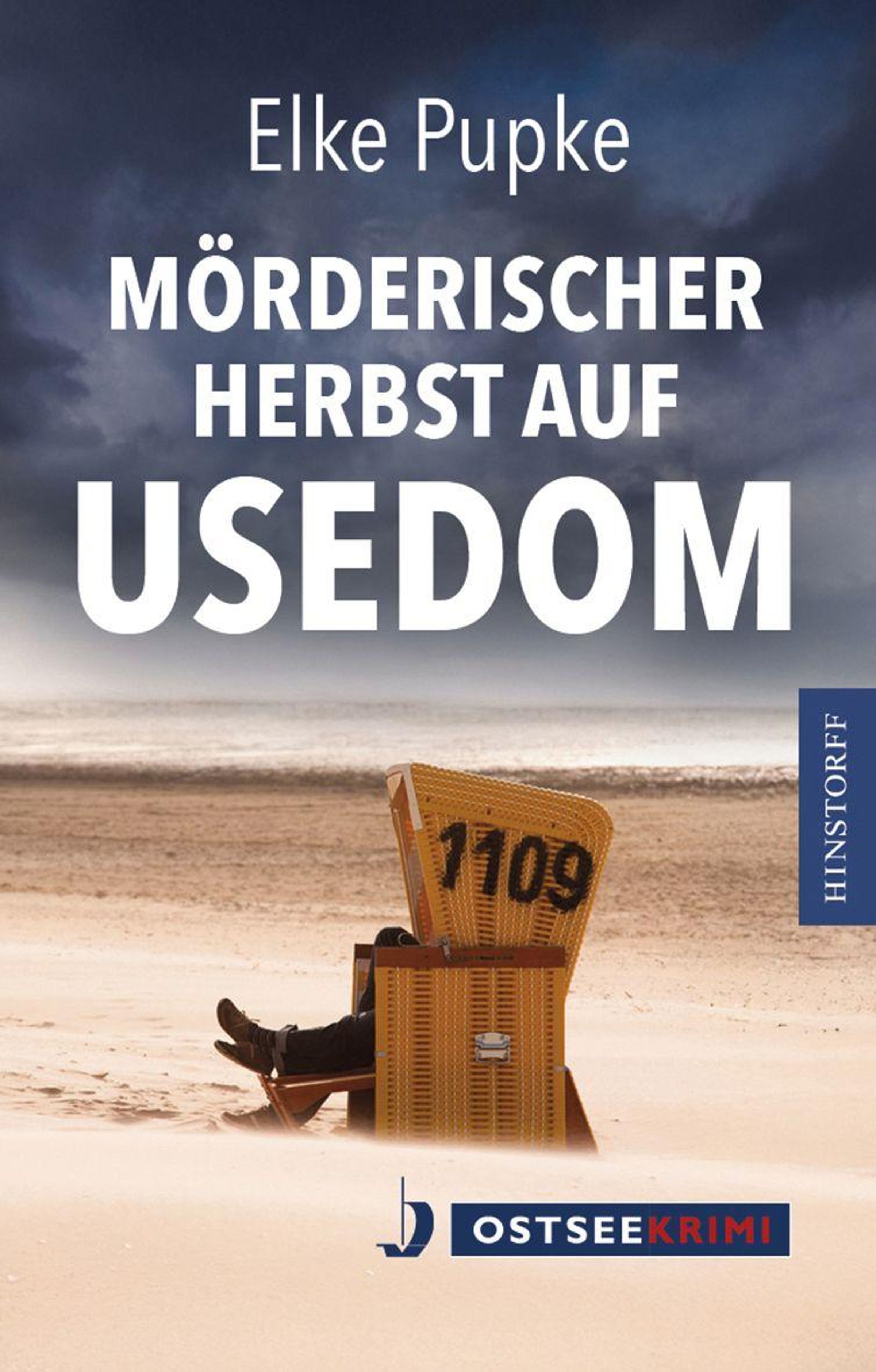 Titel: "Mörderischer Herbst auf Usedom" von Elke Pupke. Ein einsamer Strandkorb mit der Nummer 1109 am Strand, bedrohlicher Himmel., Buch
