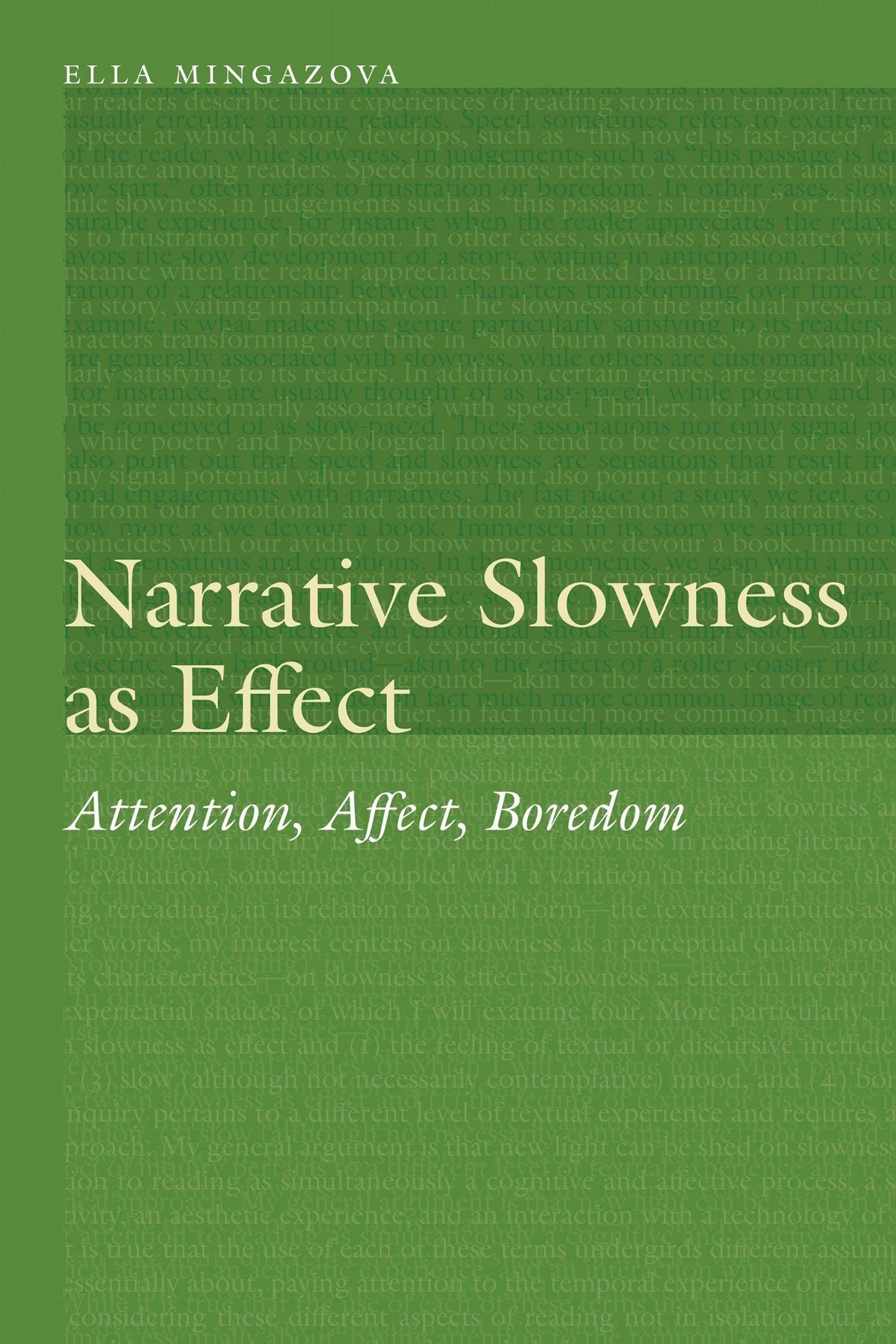 In Narrative Slowness as Effect Ella Mingazova defines narrative slowness as a sensation felt in the reading of a text that can take many shapes, both formal and experiential. She critically examines the connections between slowness and an excess of information, a prolonged attention to a text, a text's atmosphere or mood, and boredom. In addition, Mingazova establishes relations between narrative slowness and current and related concerns in cultural and literary studies such as slow violence, slow TV, slow reading, slow cinema, and cultural and social acceleration. By focusing its examination of narrative slowness on the sensation it provokes, Narrative Slowness as Effect departs from its conceptualization in classical narratology and proposes a new framework for analyzing slowness in narrative fiction.