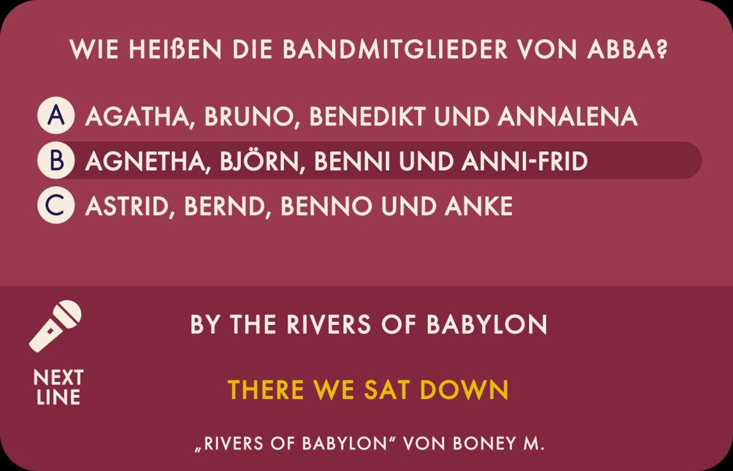 - Trivia-Spiel für Erwachsene, gegeneinander oder im Team spielbar mit über 40 Multiple Choice-Fragen und spannende Challenge zum Weitersingen