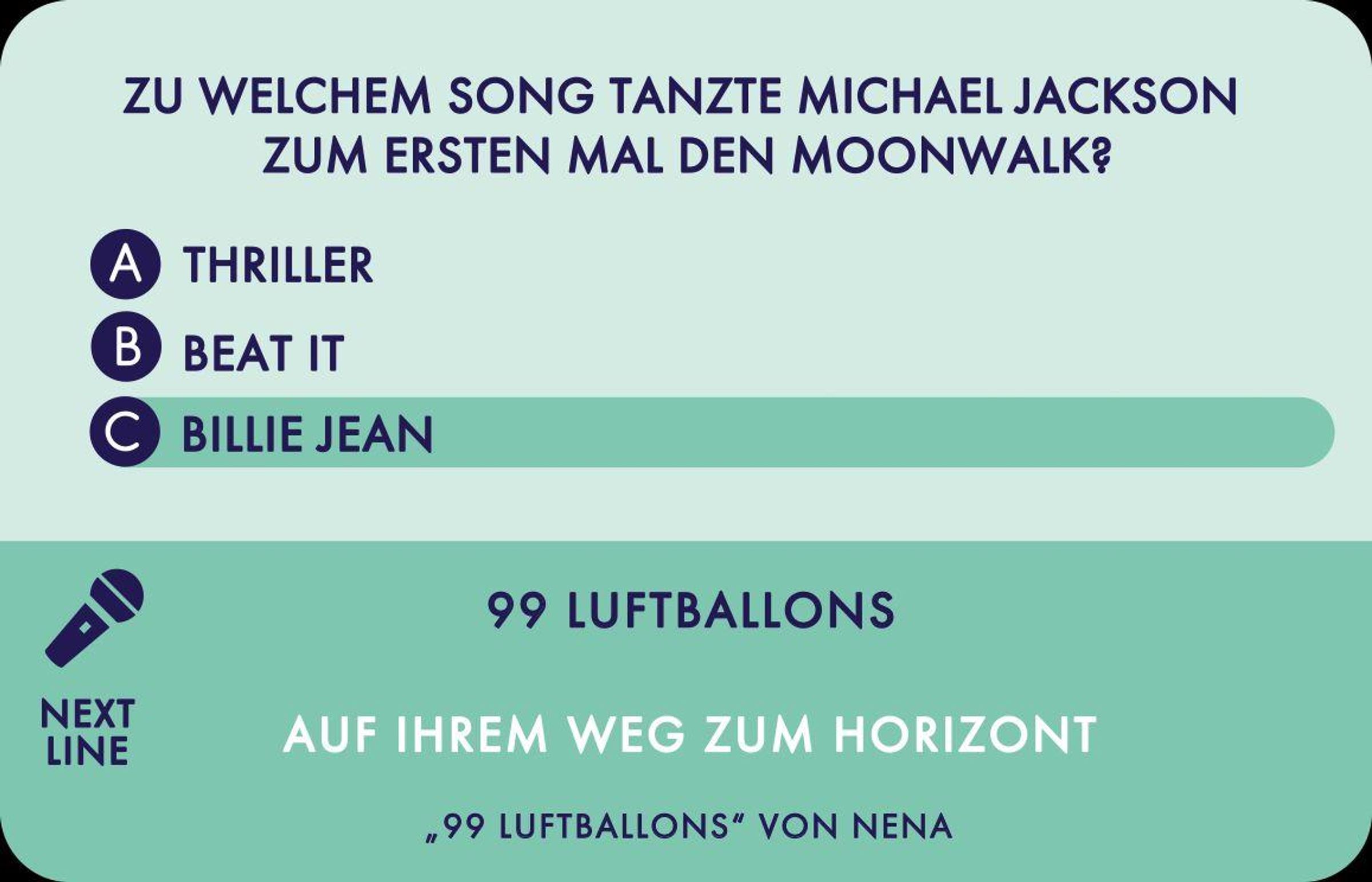 - Trivia-Spiel für Erwachsene, gegeneinander oder im Team spielbar mit über 40 Multiple Choice-Fragen und spannende Challenge zum Weitersingen