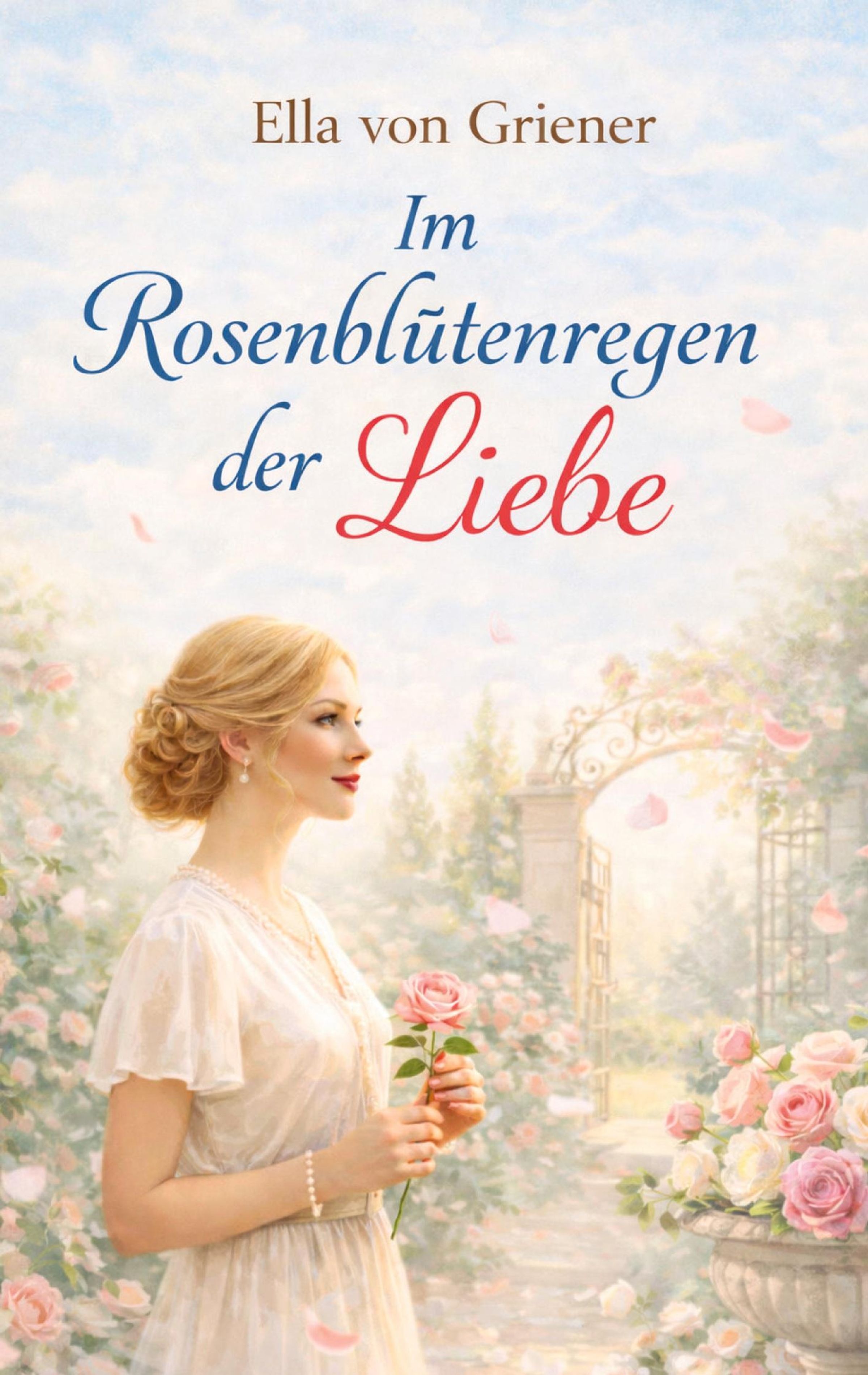 „Ella von Griener: Im Rosenblütenregen der Liebe“. Eine Frau in einem Garten, umgeben von Rosen, hält eine Blume., Buch