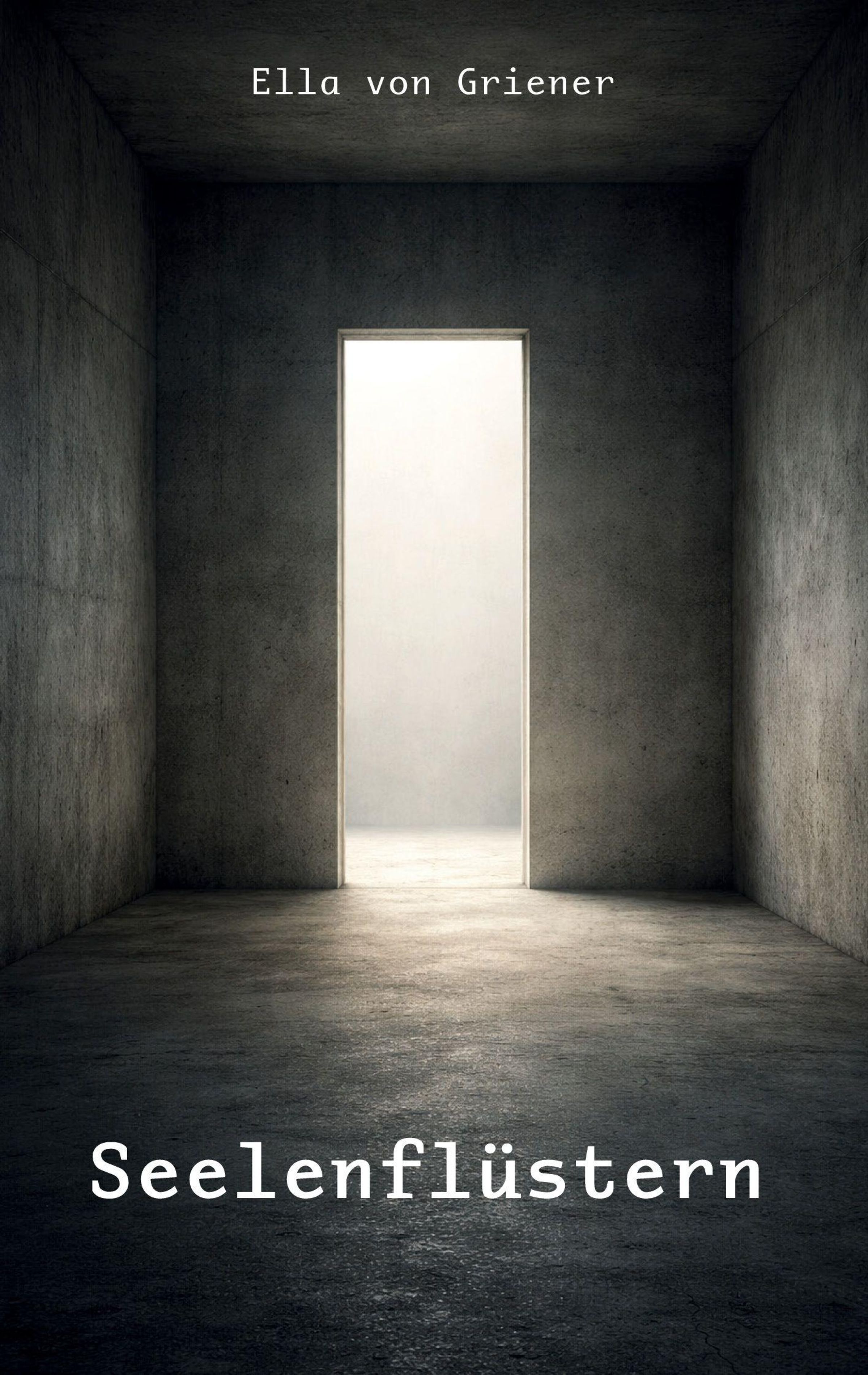 "Seelenflüstern", "Ella von Griener". Ein leerer Raum mit Betonwänden, kaum Licht von einer offenen Tür im Hintergrund., Buch
