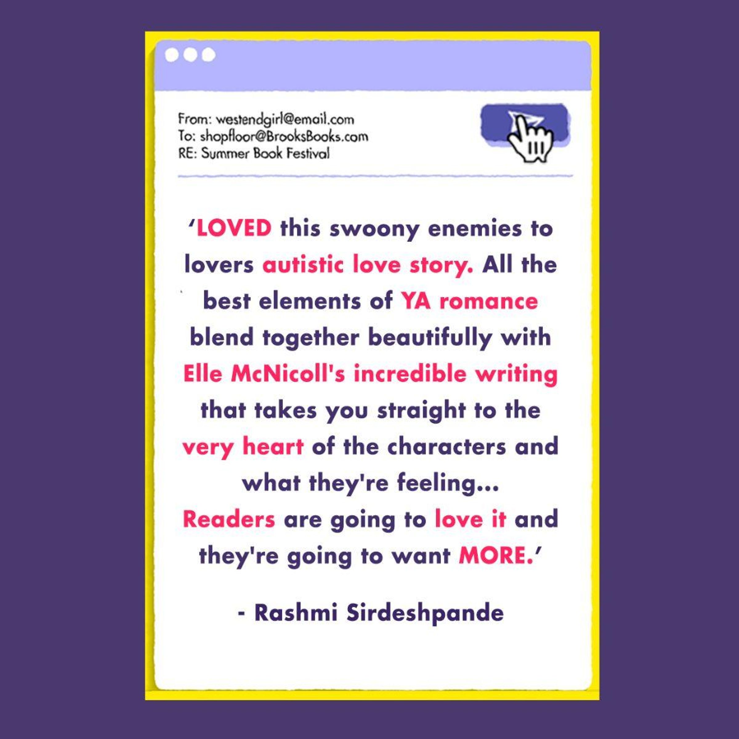 'I LOVED thisswoony enemies-to-lovers autistic love story ' - Rashmi Sirdeshpande, author of Dadaji's Paintbrush