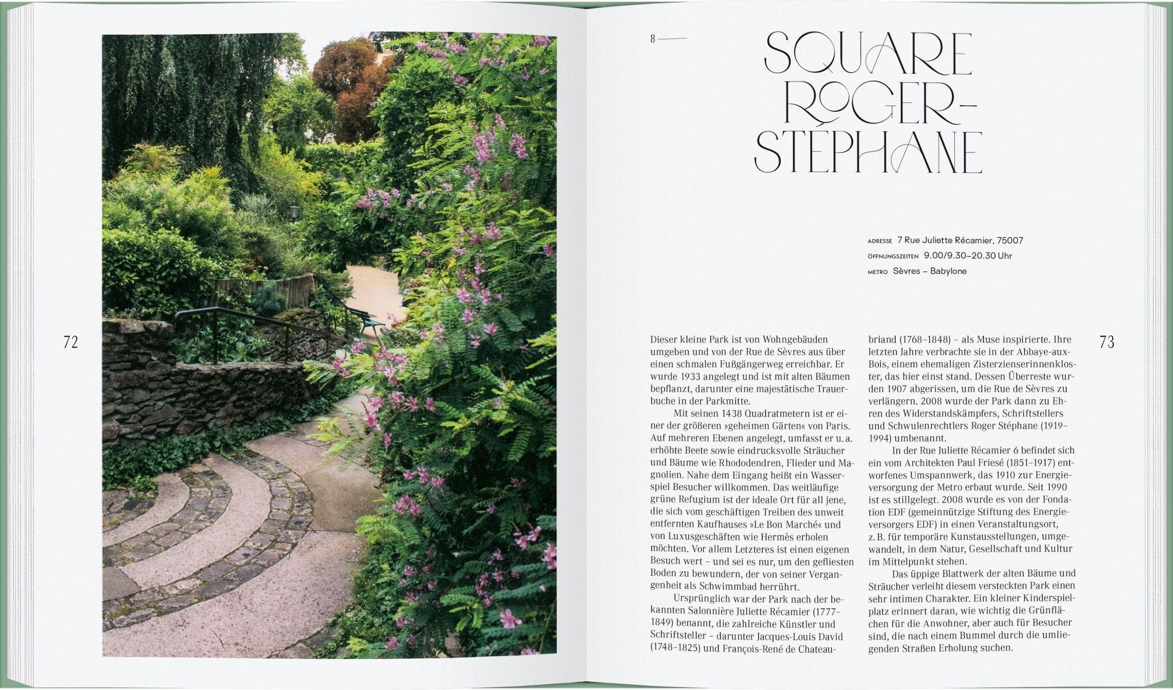 Millionen an Menschen strömen jedes Jahr nach Paris, um die herrlichen Sehenswürdigkeiten zu bestaunen, doch die wenigsten kennen die echten Schätze dieser Metropole: unzählige Gärten, Parks und grün bewachsene Plätze. In diesen Refugien kann man sich vom Trubel der Straßen erholen und sich für einen Moment wie ein Einheimischer fühlen. Entdecken Sie 20 grüne Juwelen mitten in der Stadt, die bis auf eine Ausnahme alle offen zugänglich sind. Präsentiert von Elli Ionnaou, einer renommierten Modefotografin, die diese herrlichen Orte im Zuge ihrer Arbeit - Models im Grünen fotografieren - entdeckt hat.