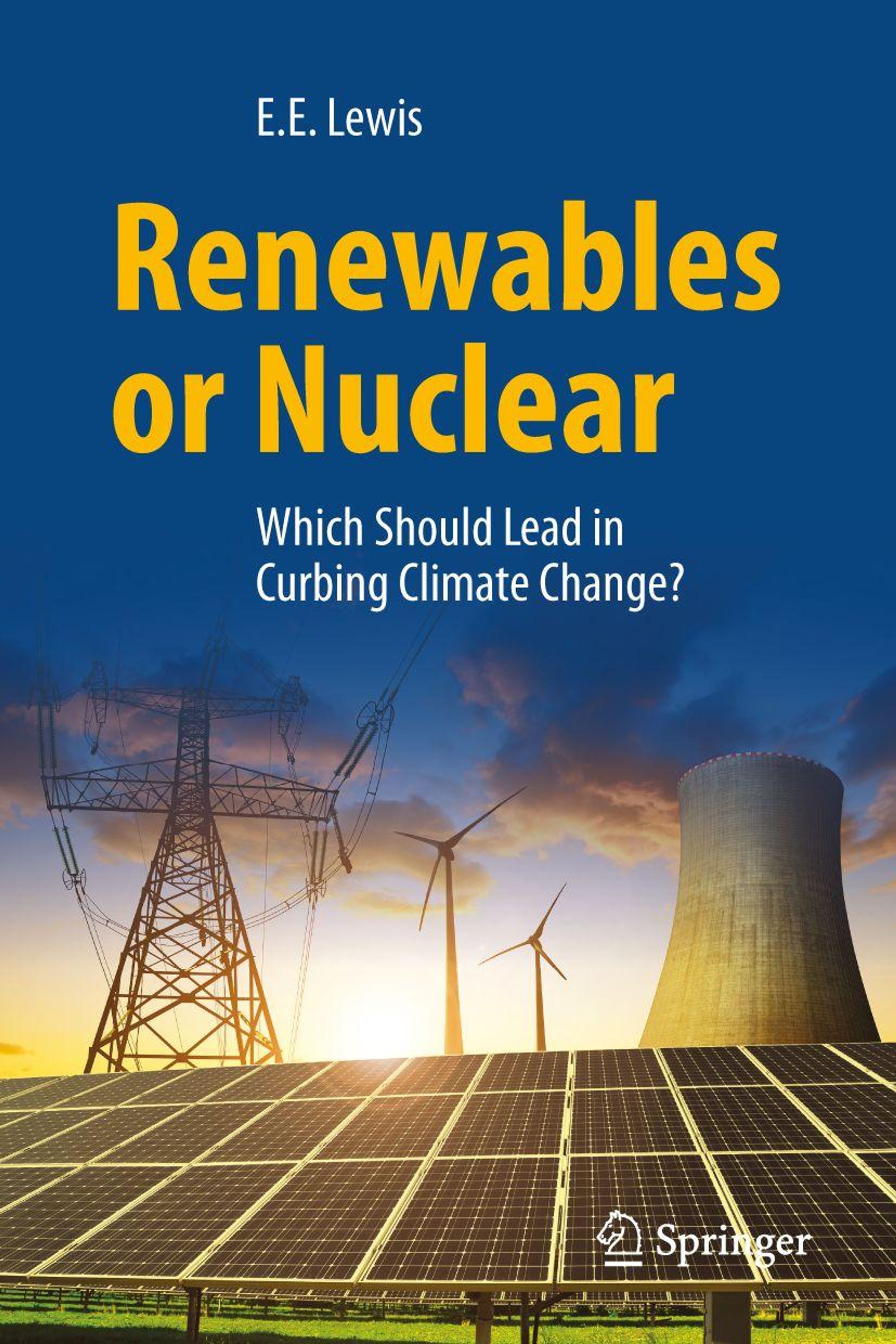 Titel: Renewables or Nuclear. Untertitel: Which Should Lead in Curbing Climate Change? Solarzellen, Windräder, Kühlturm im Hintergrund., Buch