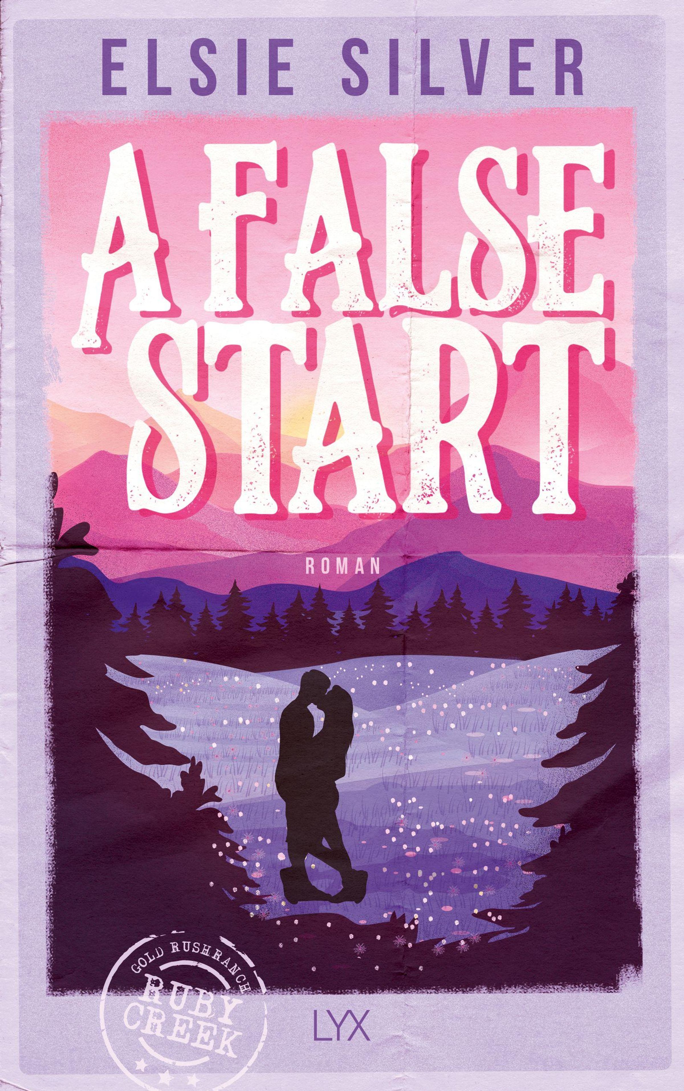 "A False Start" von Elsie Silver. Illustration einer Landschaft mit einem Paar vor einem See bei Sonnenuntergang., Buch