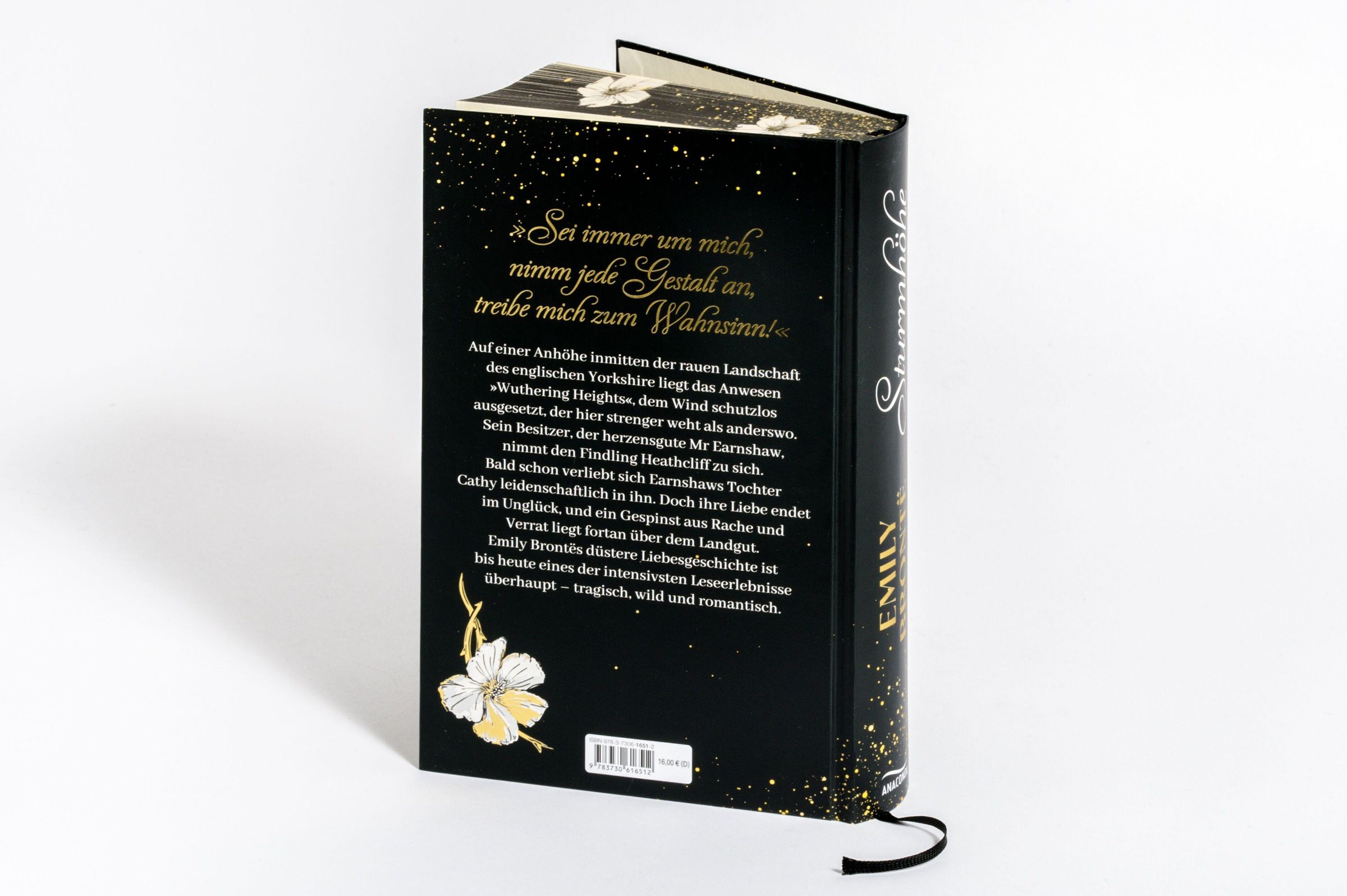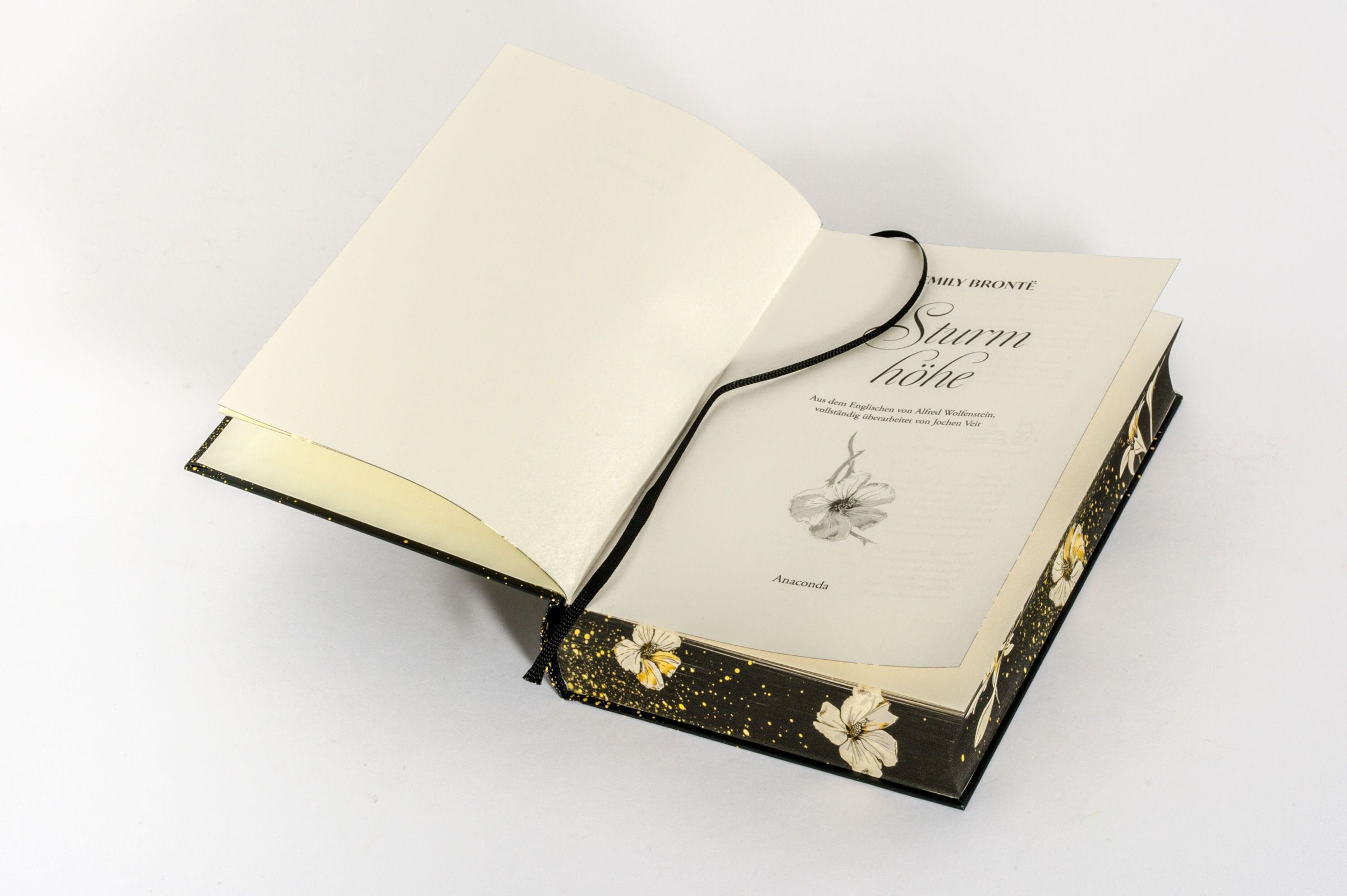 Text: "Emily Brontë", "Sturmhöhe", "Anaconda". Goldene Blumenranken und weiße Blüten auf schwarzem Hintergrund., Buch