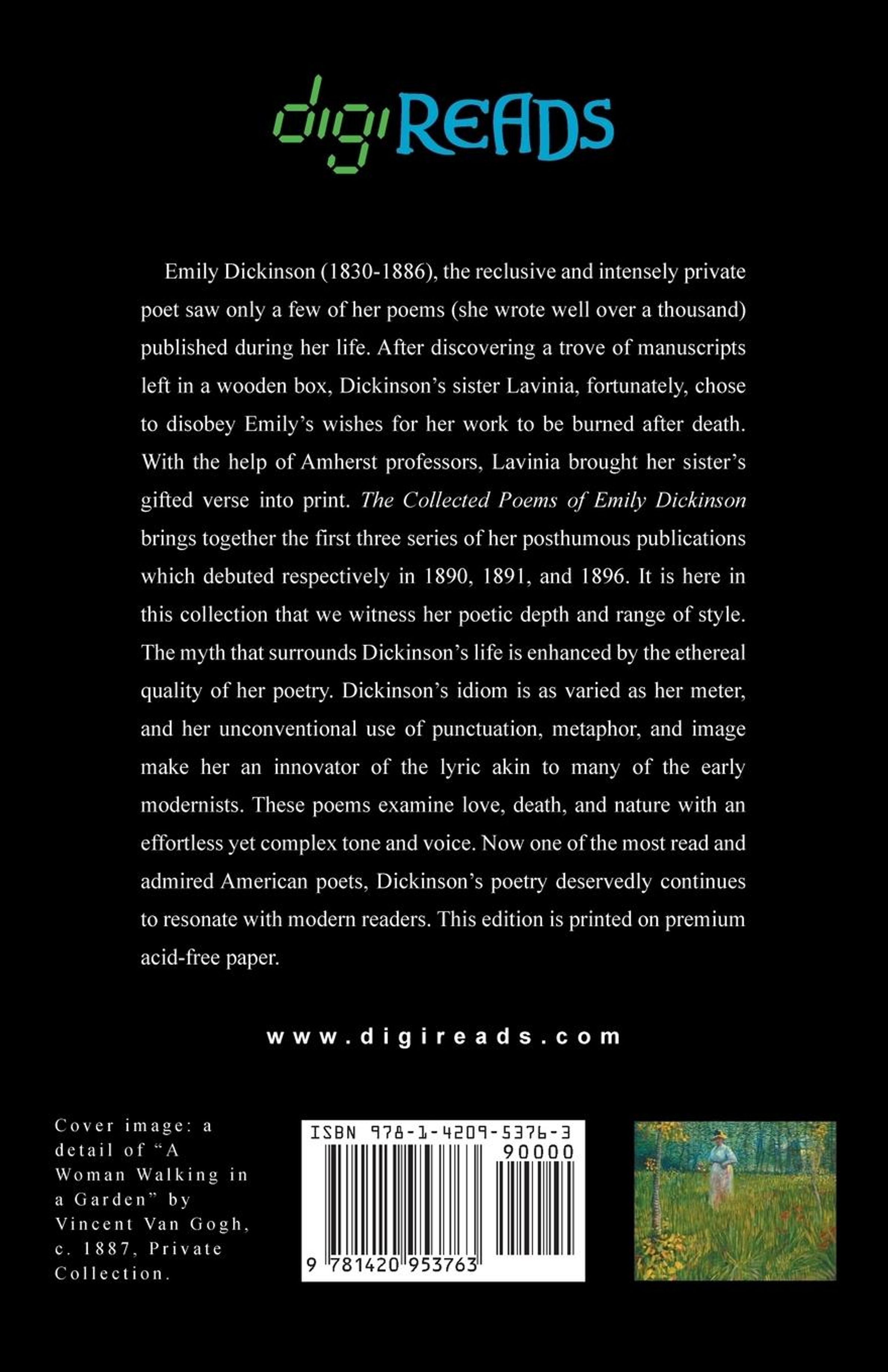 Emily Dickinson (1830-1886), the reclusive and intensely private poet saw only a few of her poems (she wrote well over a thousand) published during her life. After discovering a trove of manuscripts left in a wooden box, Dickinson's sister Lavinia, fortunately, chose to disobey Emily's wishes for her work to be burned after death. With the help of Amherst professors, Lavinia brought her sister's gifted verse into print. "The Collected Poems of Emily Dickinson" brings together the first three series of her posthumous publications which debuted respectively in 1890, 1891, and 1896. It is here in this collection that we witness her poetic depth and range of style. The myth that surrounds Dickinson's life is enhanced by the ethereal quality of her poetry. Dickinson's idiom is as varied as her meter, and her unconventional use of punctuation, metaphor, and image make her an innovator of the lyric akin to many of the early modernists. These poems examine love, death, and nature with an effortless yet complex tone and voice. Now one of the most read and admired American poets, Dickinson's poetry deservedly continues to resonate with modern readers. This edition is printed on premium acid-free paper.