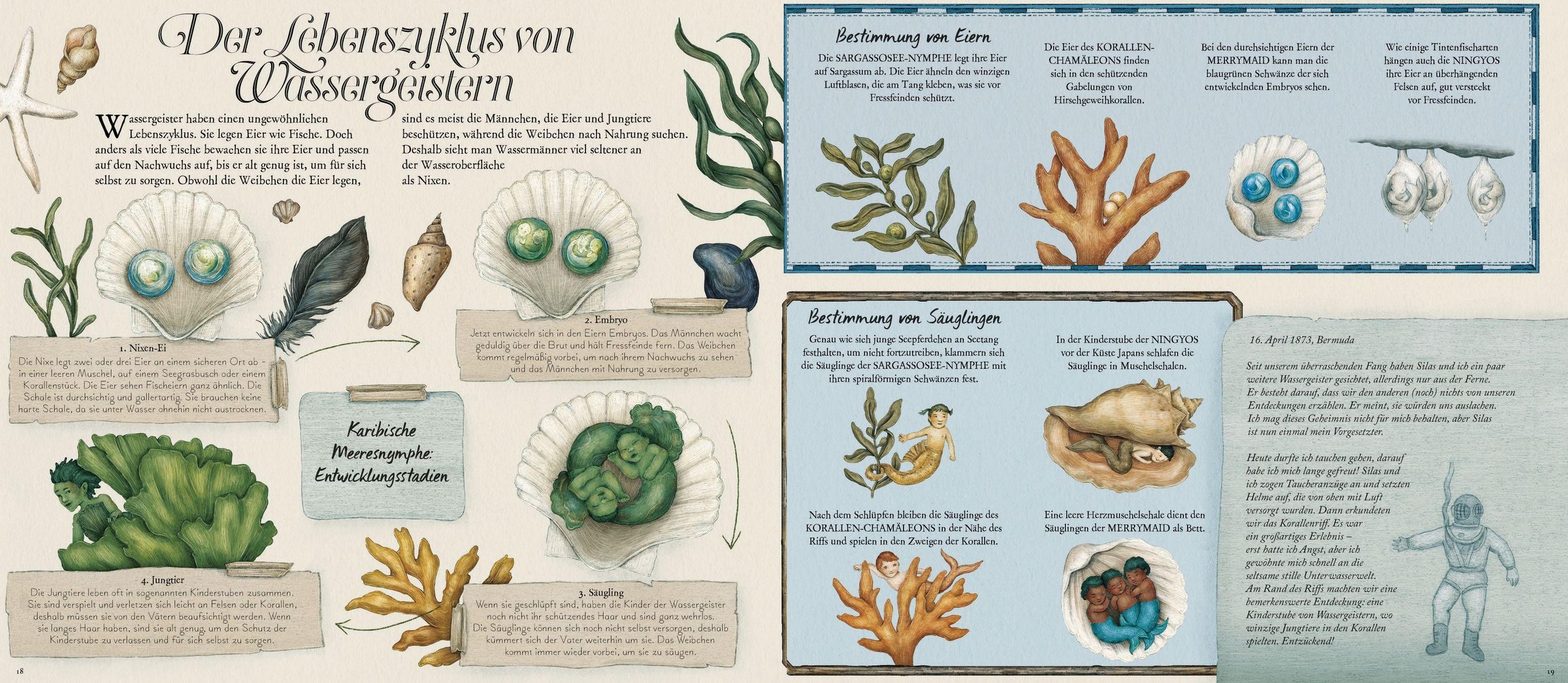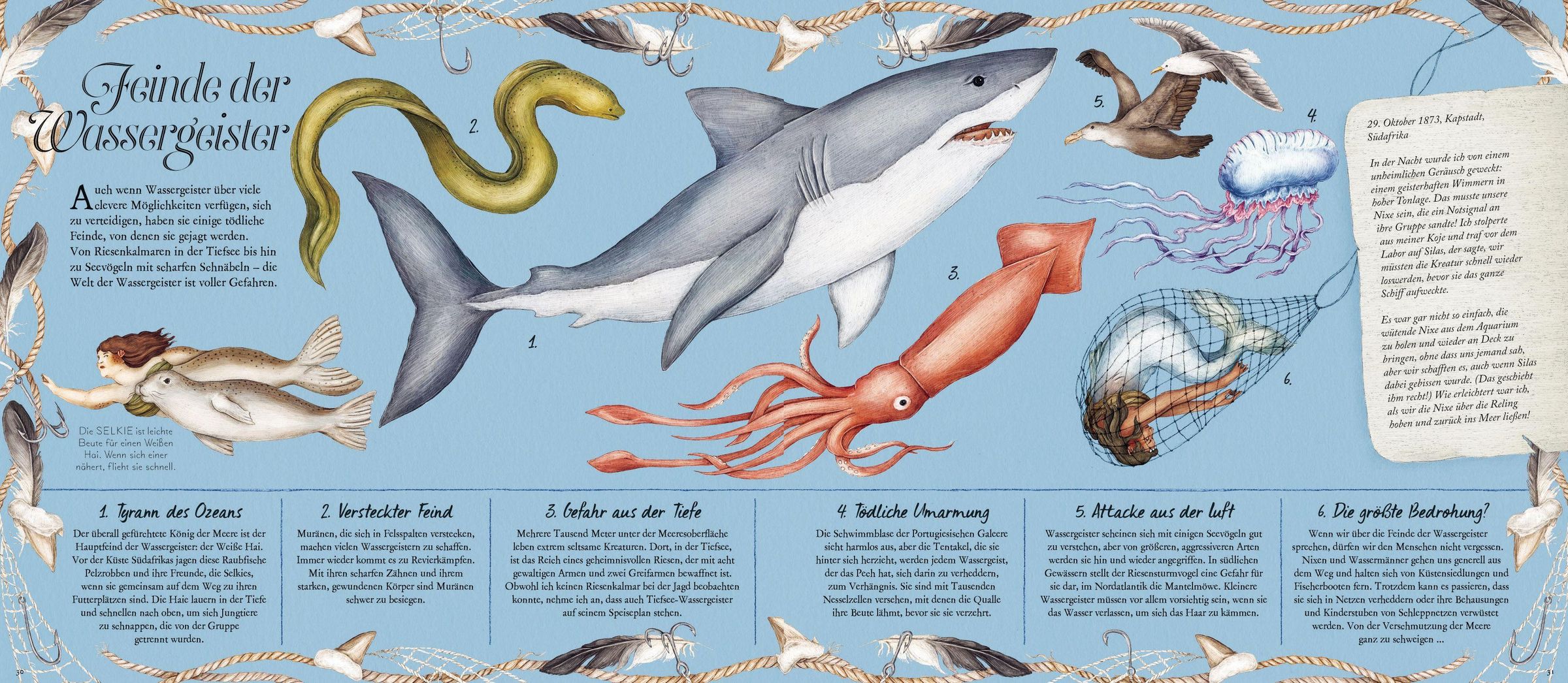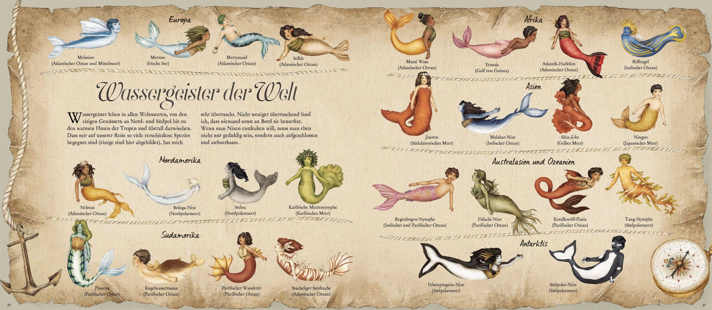 Von den Sirenen und Nereiden aus der griechischen Mythologie über die Merrymaids aus englischen Sagen bis hin zu Jiaoren aus der chinesischen Folklore: Schon seit Jahrhunderten kursieren überall auf der Welt Geschichten von mysteriösen Meeresgeschöpfen. Matrosen behaupten etwa, wunderschöne Meerjungfrauen gesichtet zu haben, die sich auf Felsen sitzend das Haar kämmten. Doch welche Arten von Nixen und Wassermännern gibt es? Wo leben Selkies und wie unterscheidet sich die Schwanzflosse einer Sargassosee-Nymphe von der einer Karibischen Meeresnymphe?