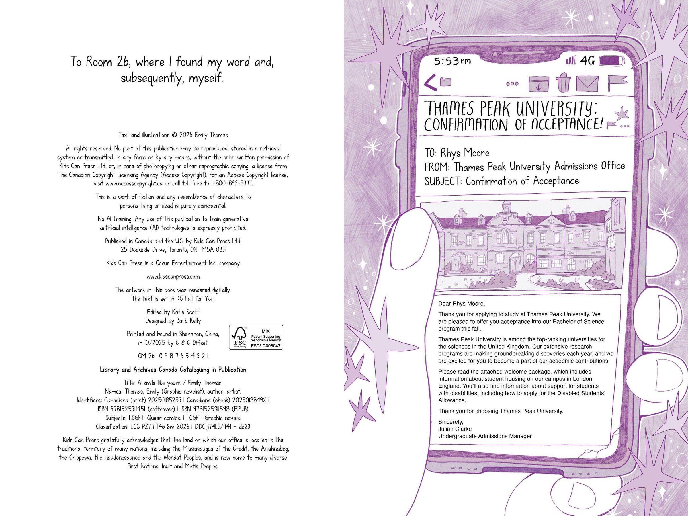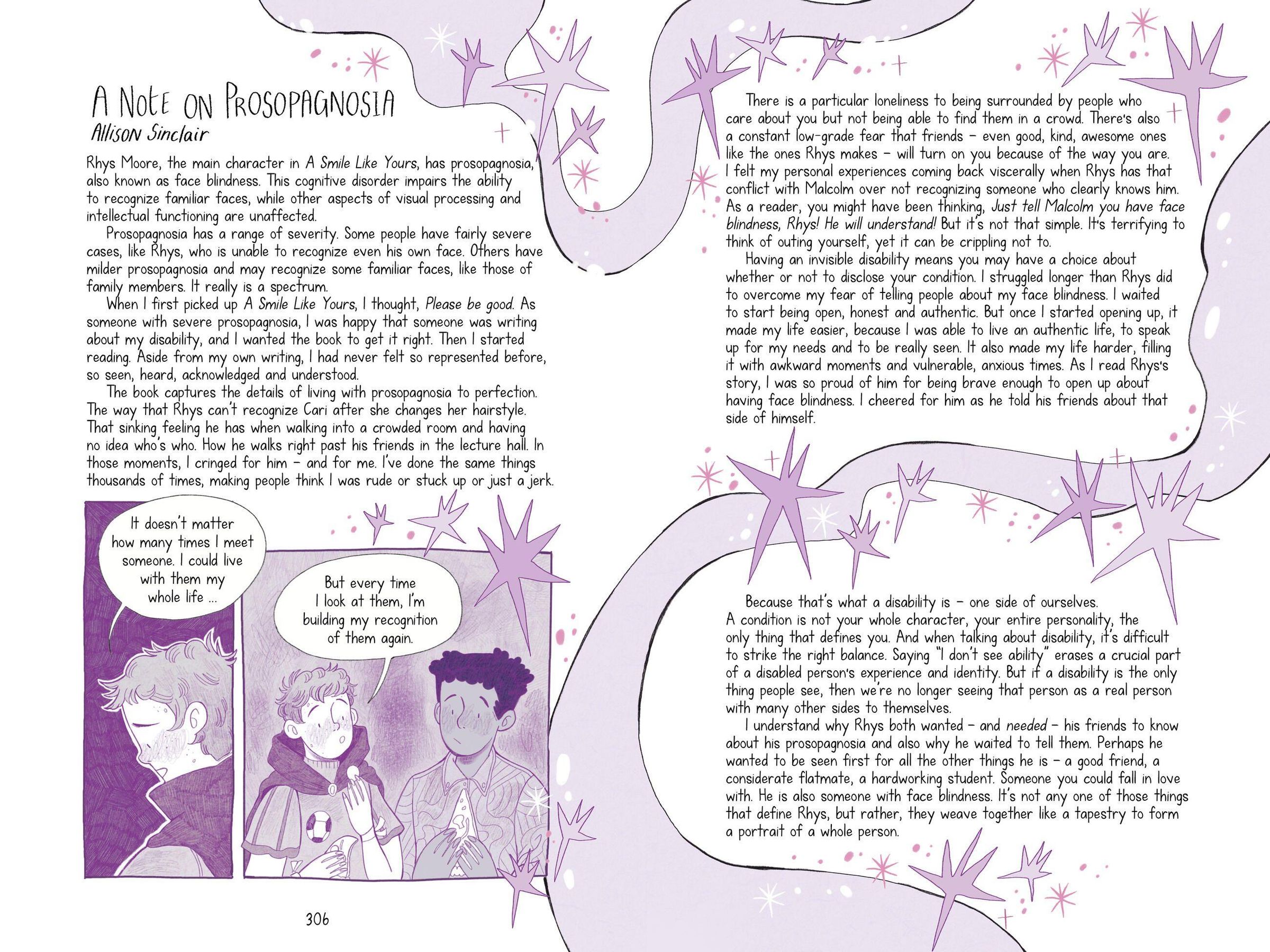 Emily Thomas's debut graphic novel offers a delightfully fresh take on falling in love and learning how to truly see another person. It's both a compelling queer romance and a pitch-perfect coming-of-age story that keenly captures the ups and downs of university life. Readers are sure to be swept up in the romance as Rhys navigates his new feelings and experiences. The book deftly explores themes of disability, friendship, love, mental health and queer identity. A note about prosopagnosia, known as face blindness, and an author's note are included at the end.
