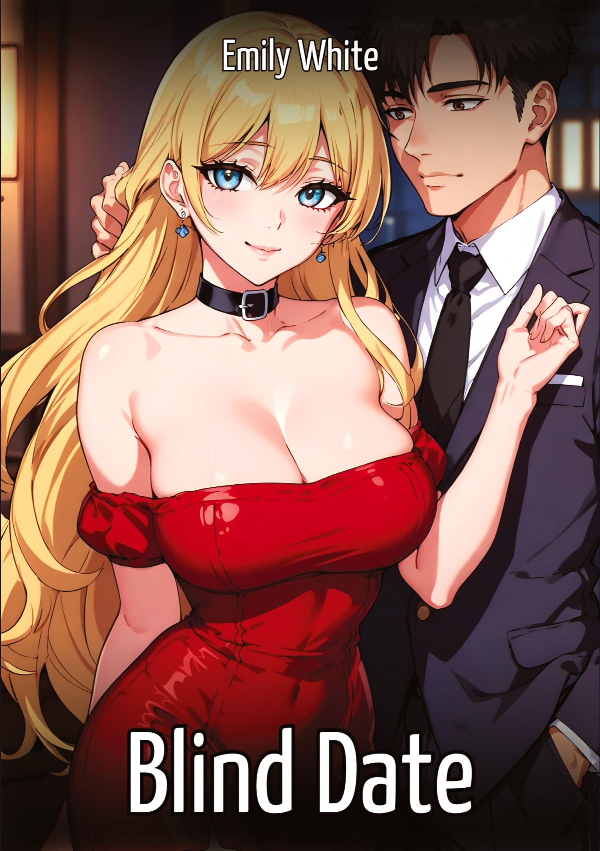 „Emily White“, „Blind Date“. Illustration: Eine blonde Frau im roten Kleid, ein Mann im Anzug neben ihr., Buch