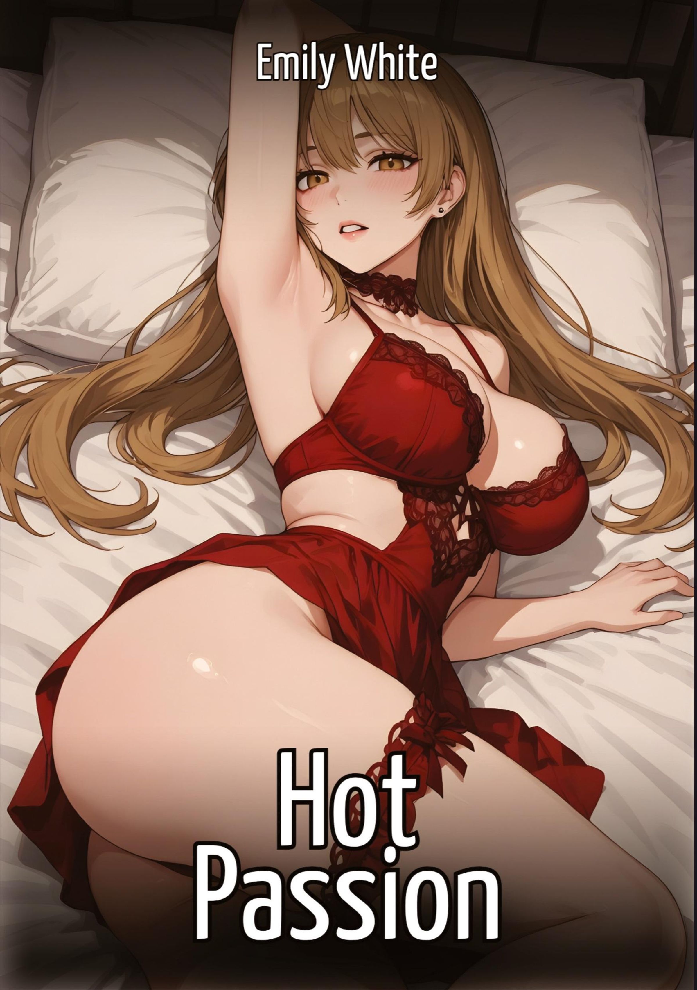 Emily White, Hot Passion. Illustration von einer Frau in roter Unterwäsche liegend auf einem Bett., Buch