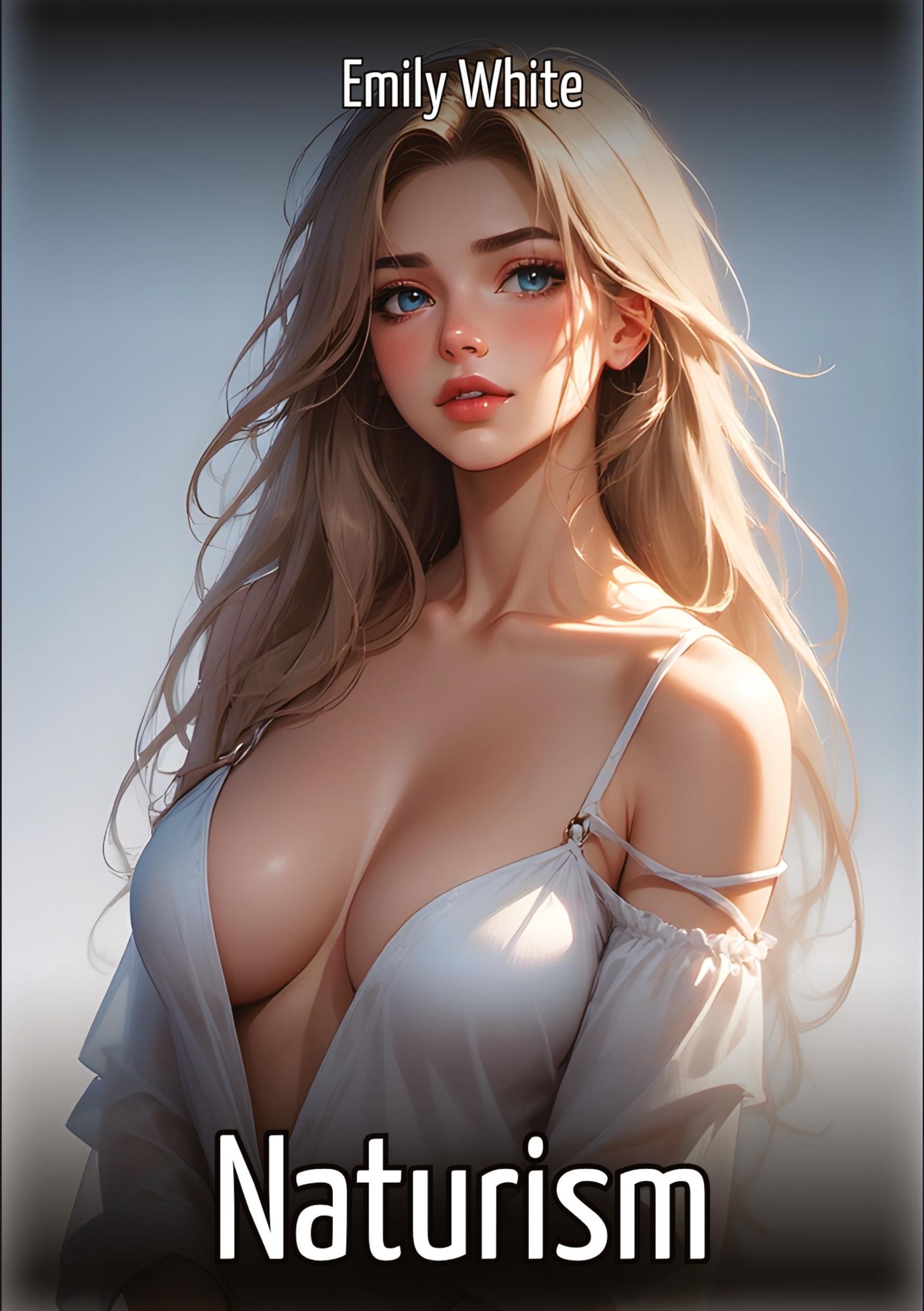 "Emily White" oben, "Naturism" unten. Illustration einer Frau mit langen, blonden Haaren und blauer Kleidung., Buch