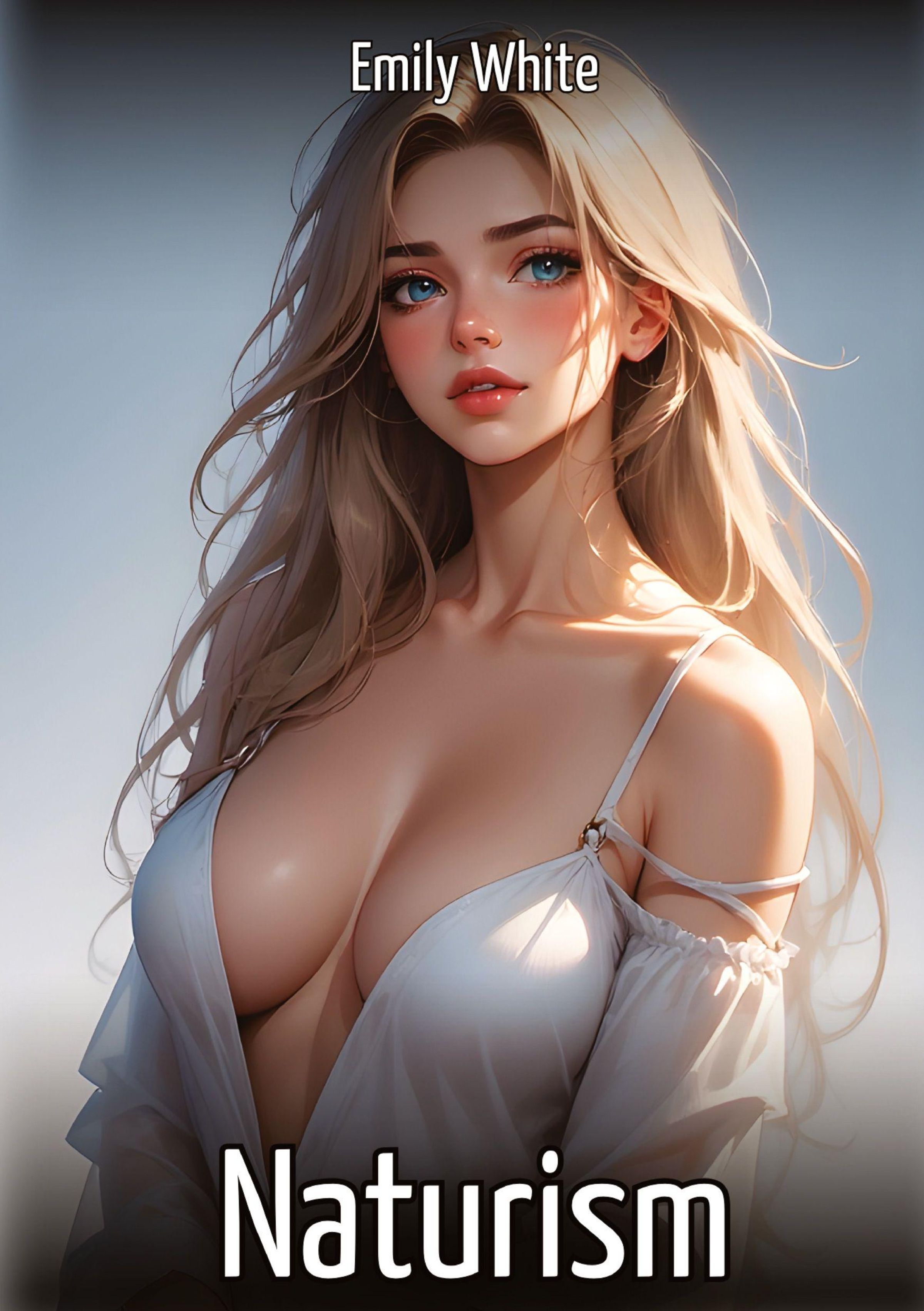 "Emily White" oben, "Naturism" unten. Illustration einer Frau mit langem, blondem Haar in weißem Kleid., Buch