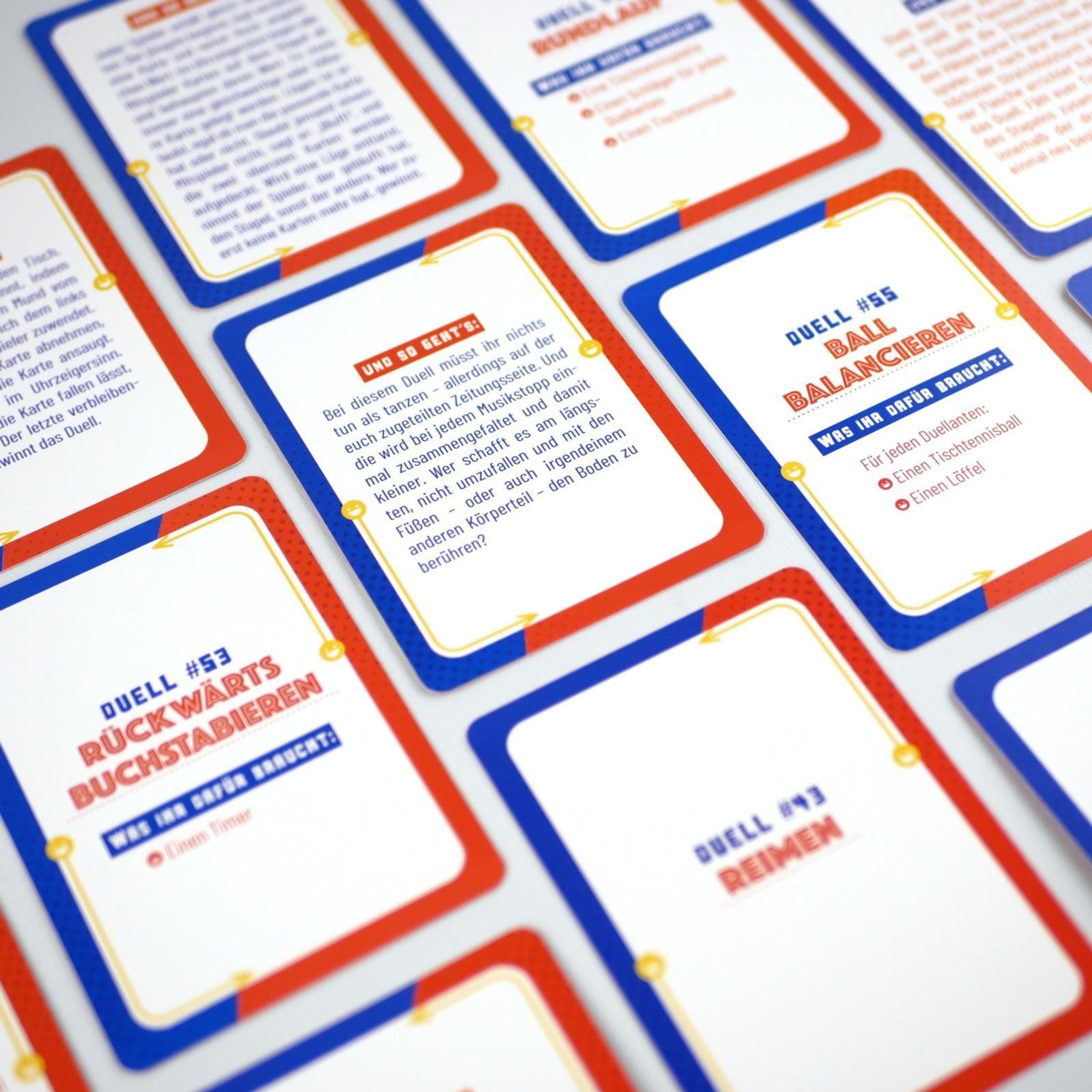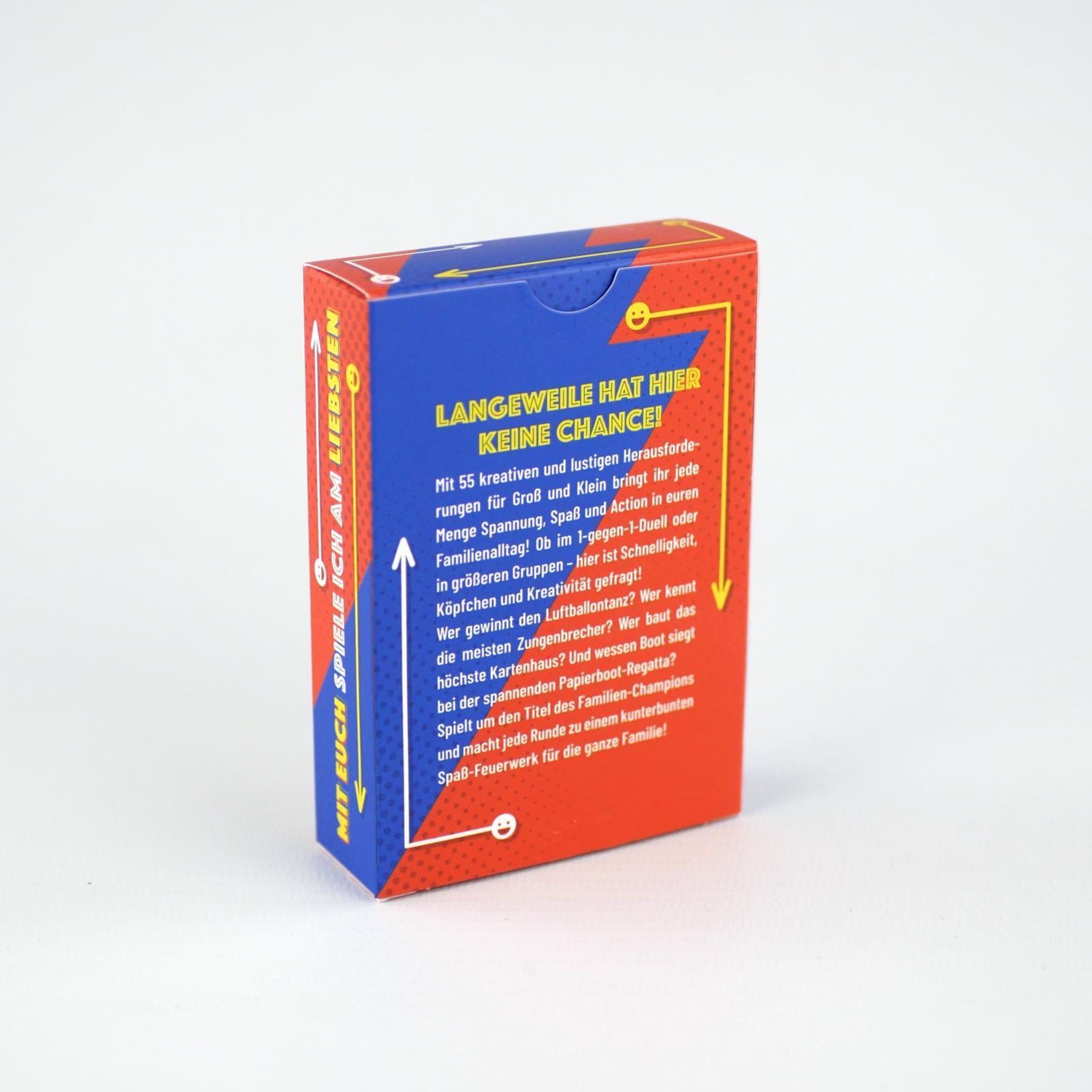 'Mama, Papa, mir ist so langweilig!' - ein Satz, den wohl jede Familie kennt. Dieses Kartendeck ist die perfekte Antwort darauf! 55 brandneue Challenges fordern zwei Familienmitglieder oder auch größere Teams zu kleinen Wettkämpfen heraus und bringen frischen Schwung in lange Tage, ruhige Wochenenden oder Familienurlaube. Ob spannende Challenges, kleine Geschicklichkeitsspiele oder witzige Ratespiele - hier ist für alle was dabei. Mal zählt Schnelligkeit, mal ist Kreativität gefragt, mal ein gutes Gedächtnis. Perfekt für Spieleabende, Regentage oder spontane Familienrunden und ein Geschenk, das gemeinsames Erleben und jede Menge Spaß garantiert.