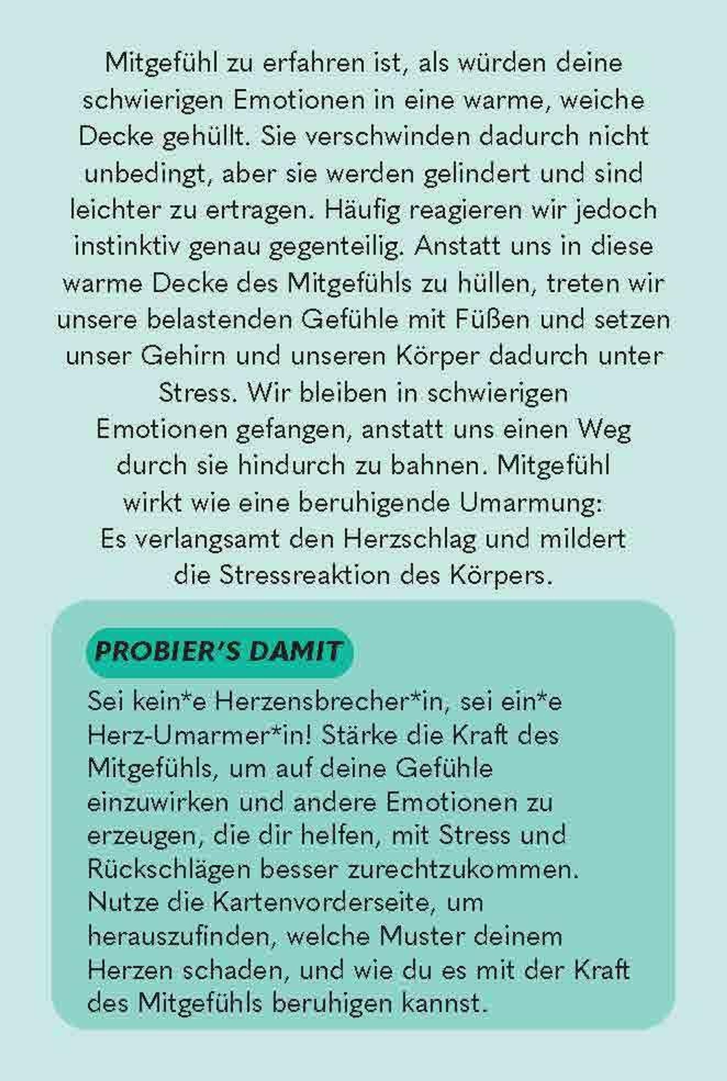 In dieser wunderschön gestalteten Box finden Sie 40 Karten, die Sie behutsam dabei unterstützen, zu mehr Ruhe und Gelassenheit zu finden. Die Psychologin und Illustratorin Dr. Emma Hepburn alias "The Psychology Mum" kombiniert ihre charakteristischen, fröhlichen Illustrationen mit klaren, praktischen Ideen aus der Psychologie: kleine Anregungen, die helfen, Ängste zu lindern, die Stimmung zu heben und Momente der Ruhe und Achtsamkeit zu schaffen. Hug in a Box ist ein liebevolles Geschenk für Freund*innen oder Familie, kann aber auch als Selbstkauf Trost und Mut spenden.