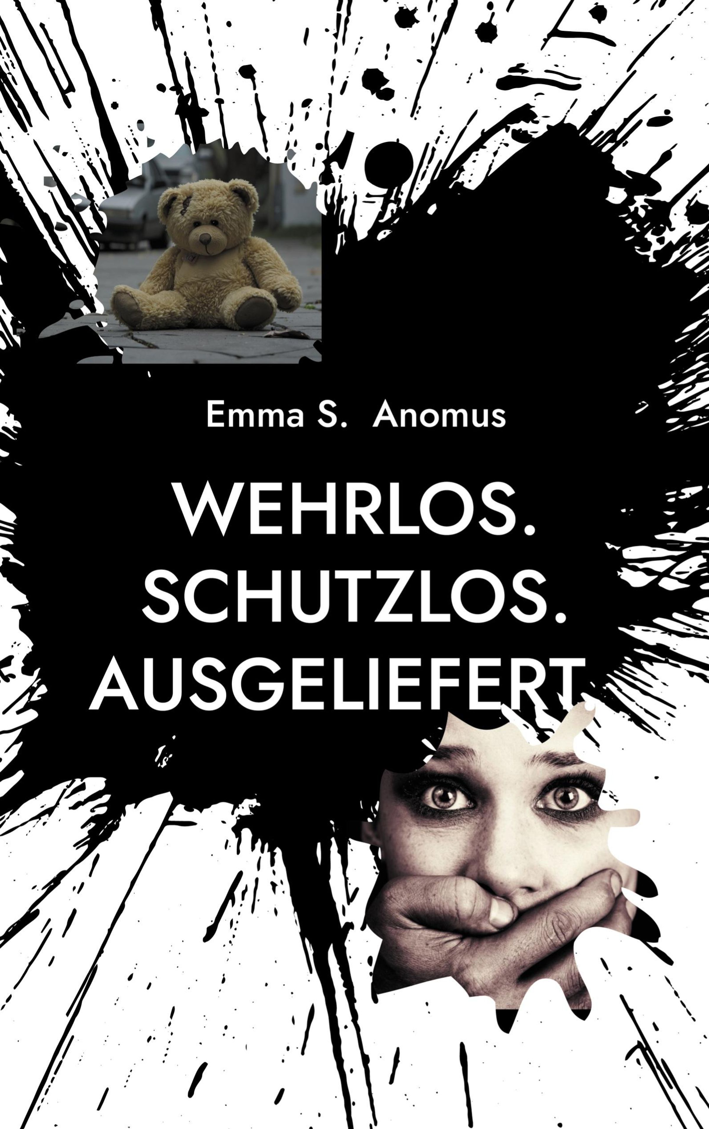 "Emma S. Anomus. WEHRLOS. SCHUTZLOS. AUSGELIEFERT." Ein Teddybär und ein Gesicht mit zugehaltener Hand, schwarz-weiß., Buch