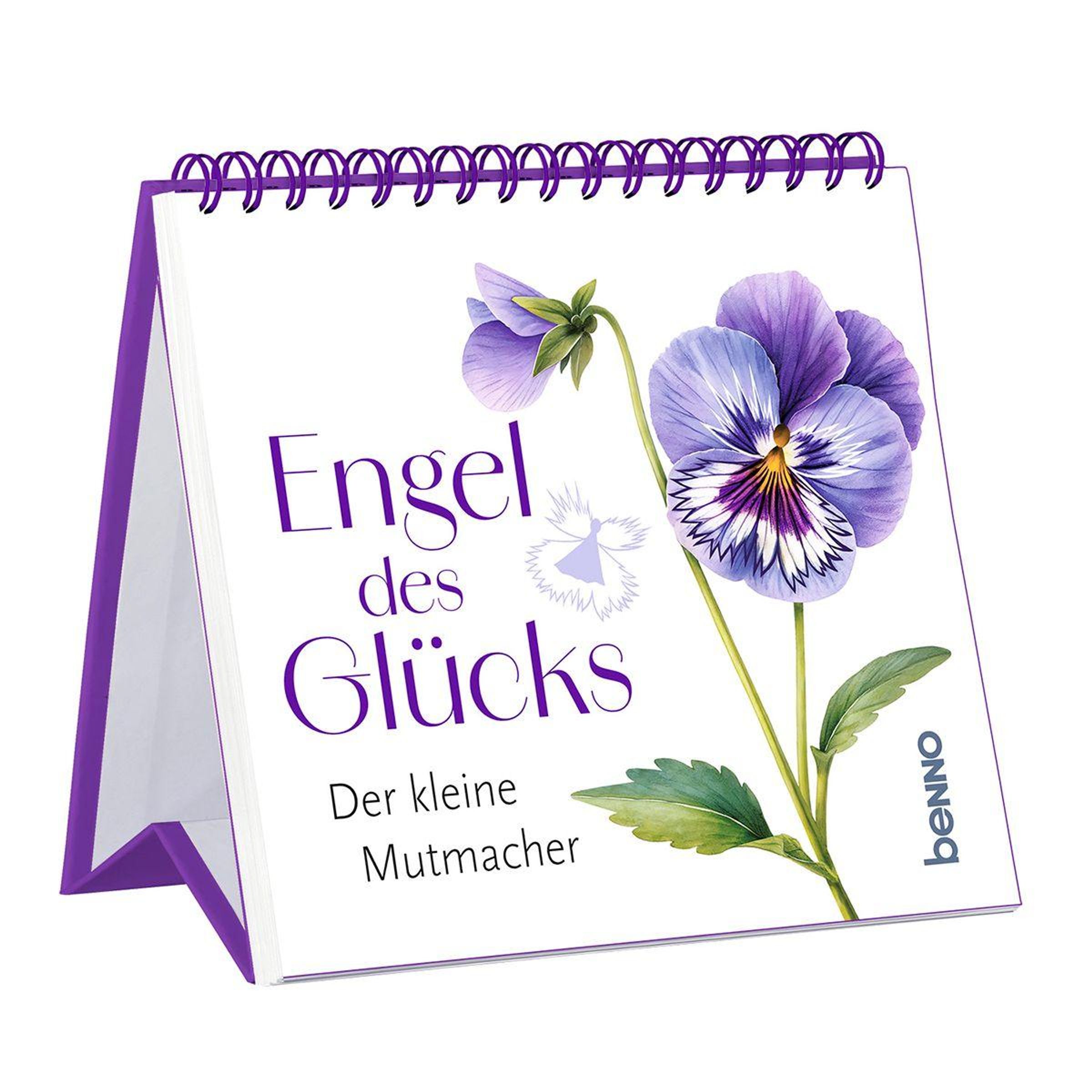 "Engel des Glücks" und "Der kleine Mutmacher". Illustration einer violetten Blume mit grünen Blättern auf einem Tischkalender., Buch