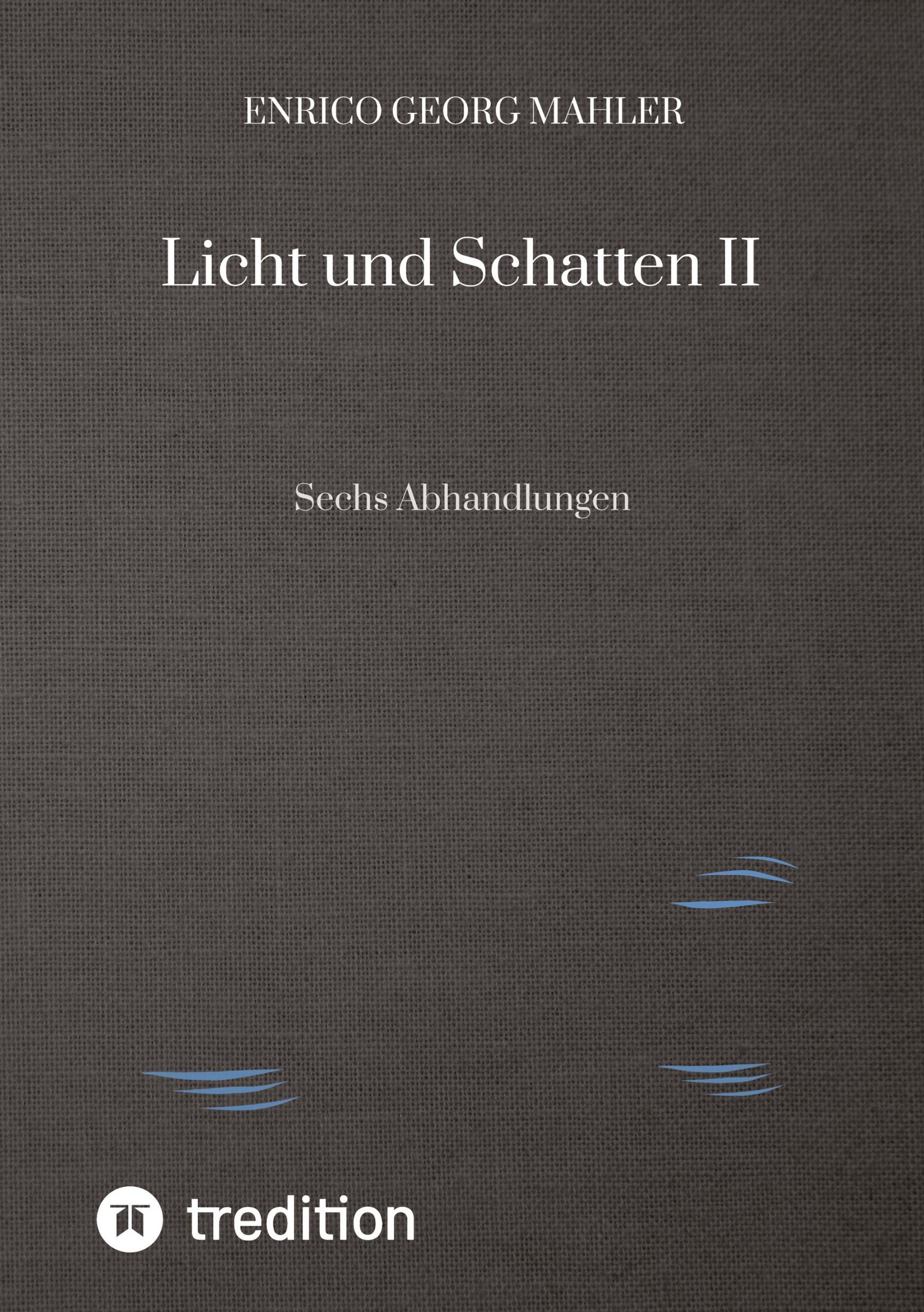 „ENRICO GEORG MAHLER, Licht und Schatten II, Sechs Abhandlungen“. Grauer Hintergrund, Logo unten links., Buch