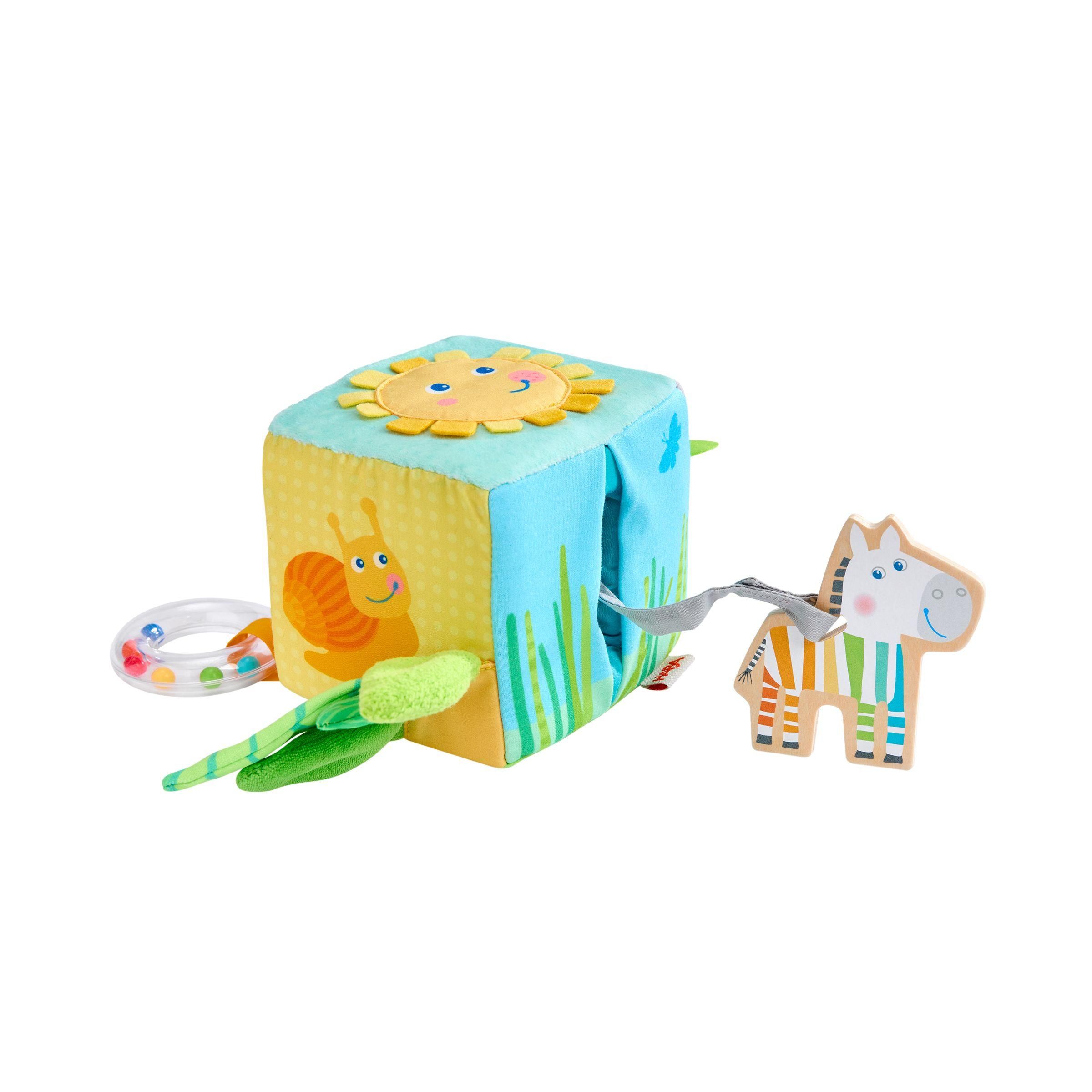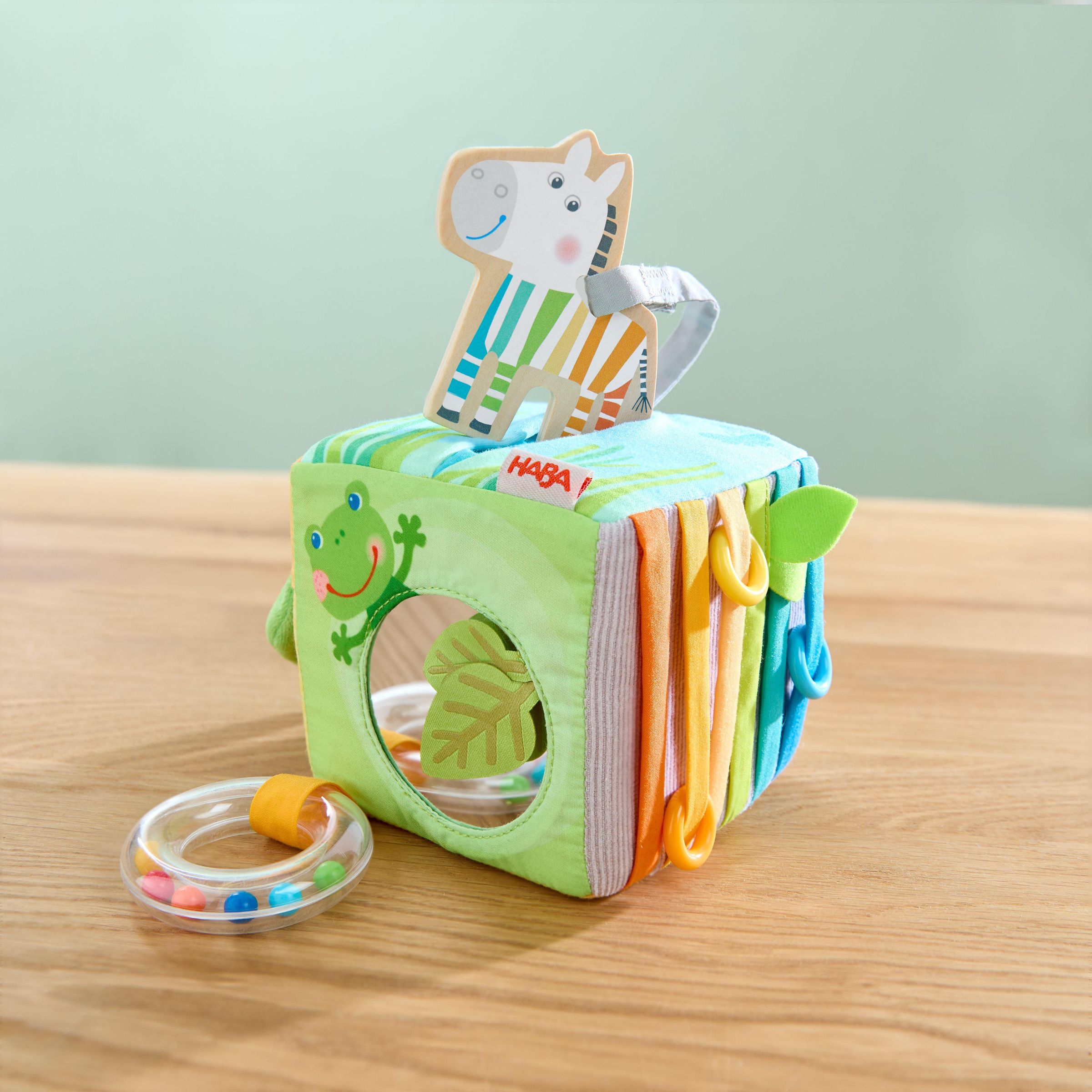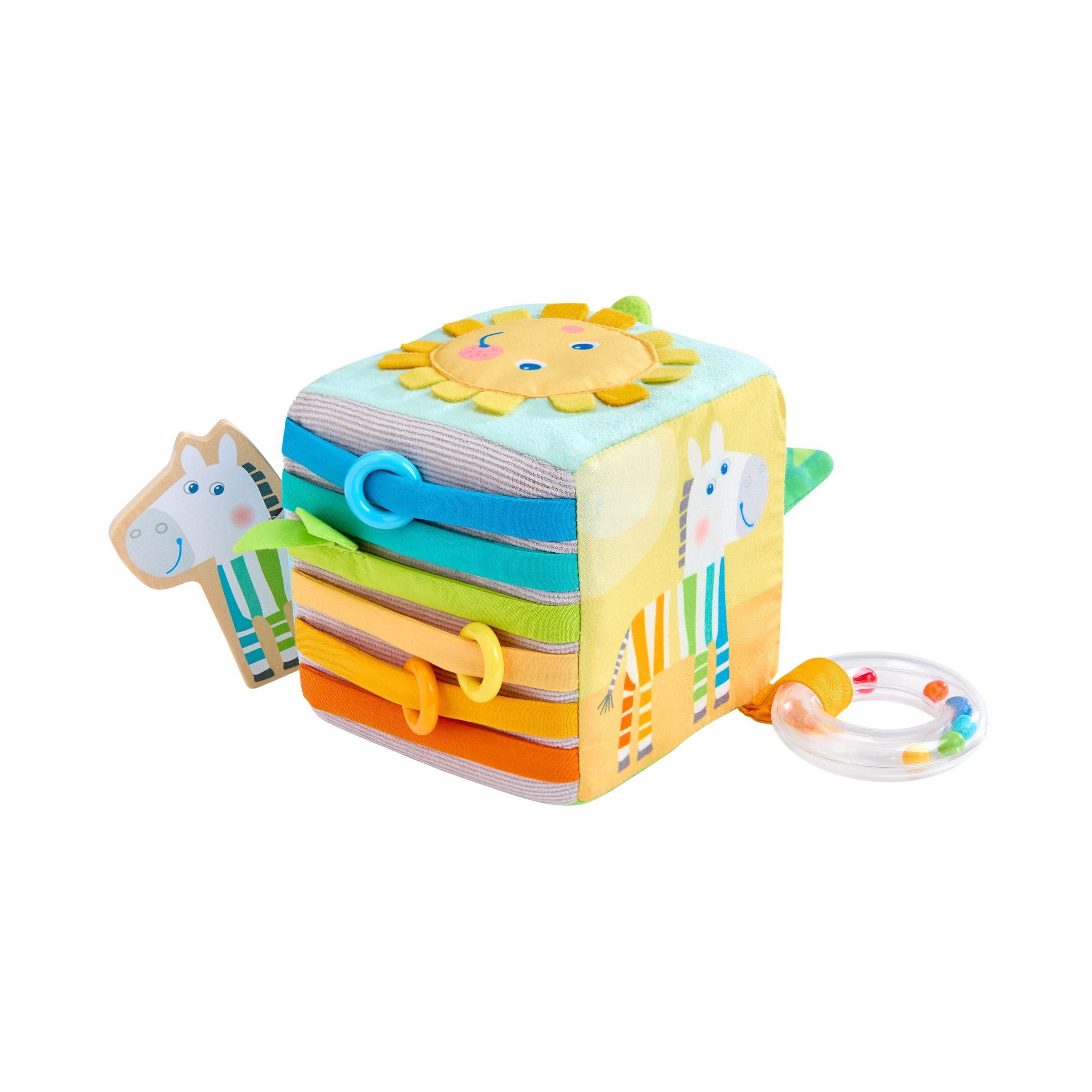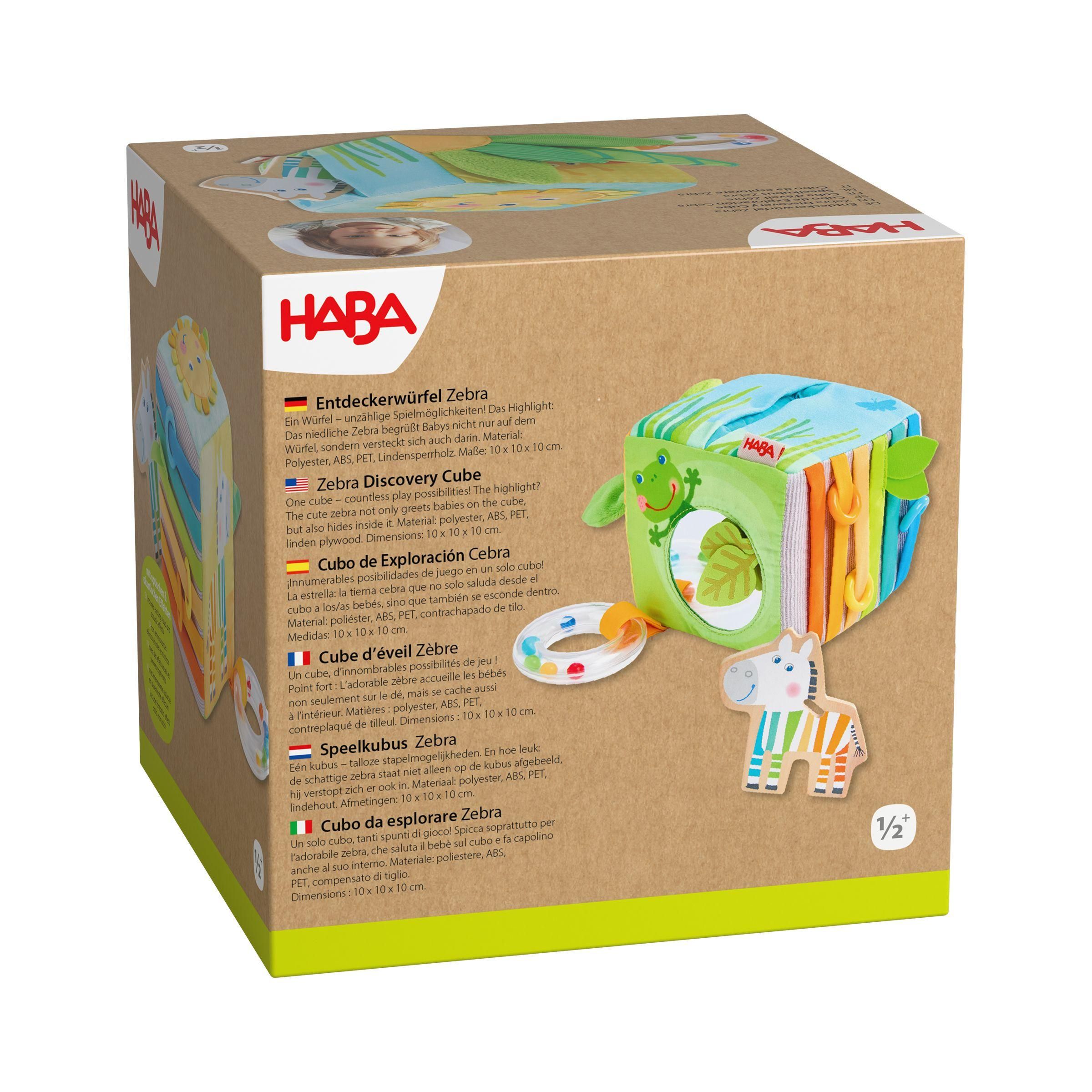 Ein Würfel - unzählige Spielmöglichkeiten! Das Highlight: Das niedliche Zebra begrüßt Babys nicht nur auf dem Würfel, sondern versteckt sich auch darin. Neugierige kleine Entdecker können die Zebrafigur aus Holz herausziehen und sogar abnehmen. Und auf jeder Seite dieses Würfels gibt es etwas Neues zu entdecken: hier eine Rassel, da ein Spiegel, dort Kunststoffringe zum Erfühlen und Verschieben. Die vielen Elemente und Effekte regen die Sinne der Babys an und laden zum ausgiebigen Spielen und Erkunden ein.