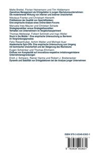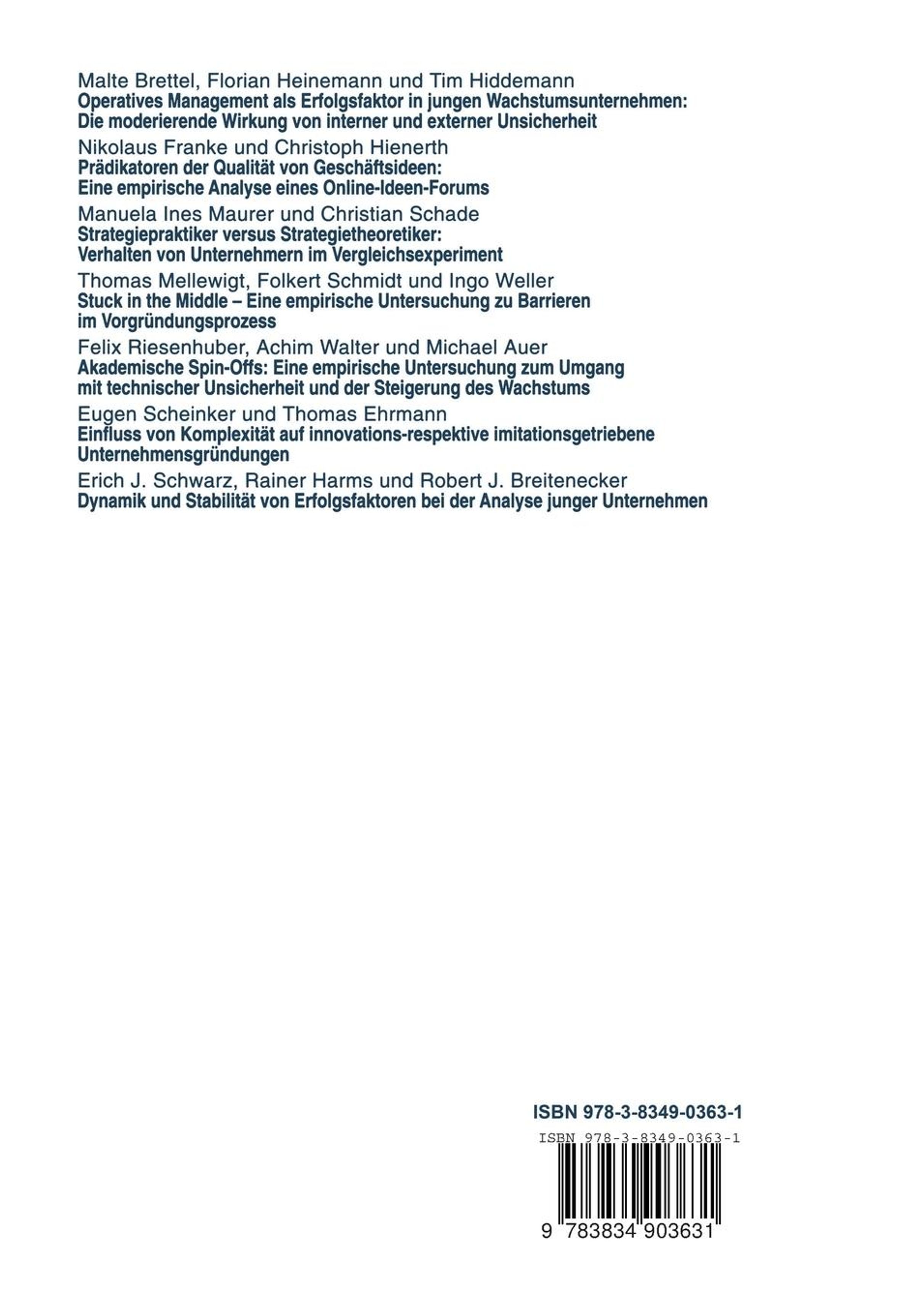 Dieses Special Issue zeigt die Bedeutung des operativen Managements für den Erfolg von Gründungsunternehmen in innovativen und schnell wachsenden Branchen, die Qualität von Geschäftsideen am Beispiel von Online-Ideen-Foren, das Strategieverhalten von Gründern, die Barrieren im Gründungsprozess, Spin-Offs aus Universitäten und außeruniversitären Forschungseinrichtungen, innovations- und imitationsgetriebene Unternehmensgründungen und untersucht die Stabilität bzw. die Veränderung von Erfolgsfaktoren bei Gründungen.