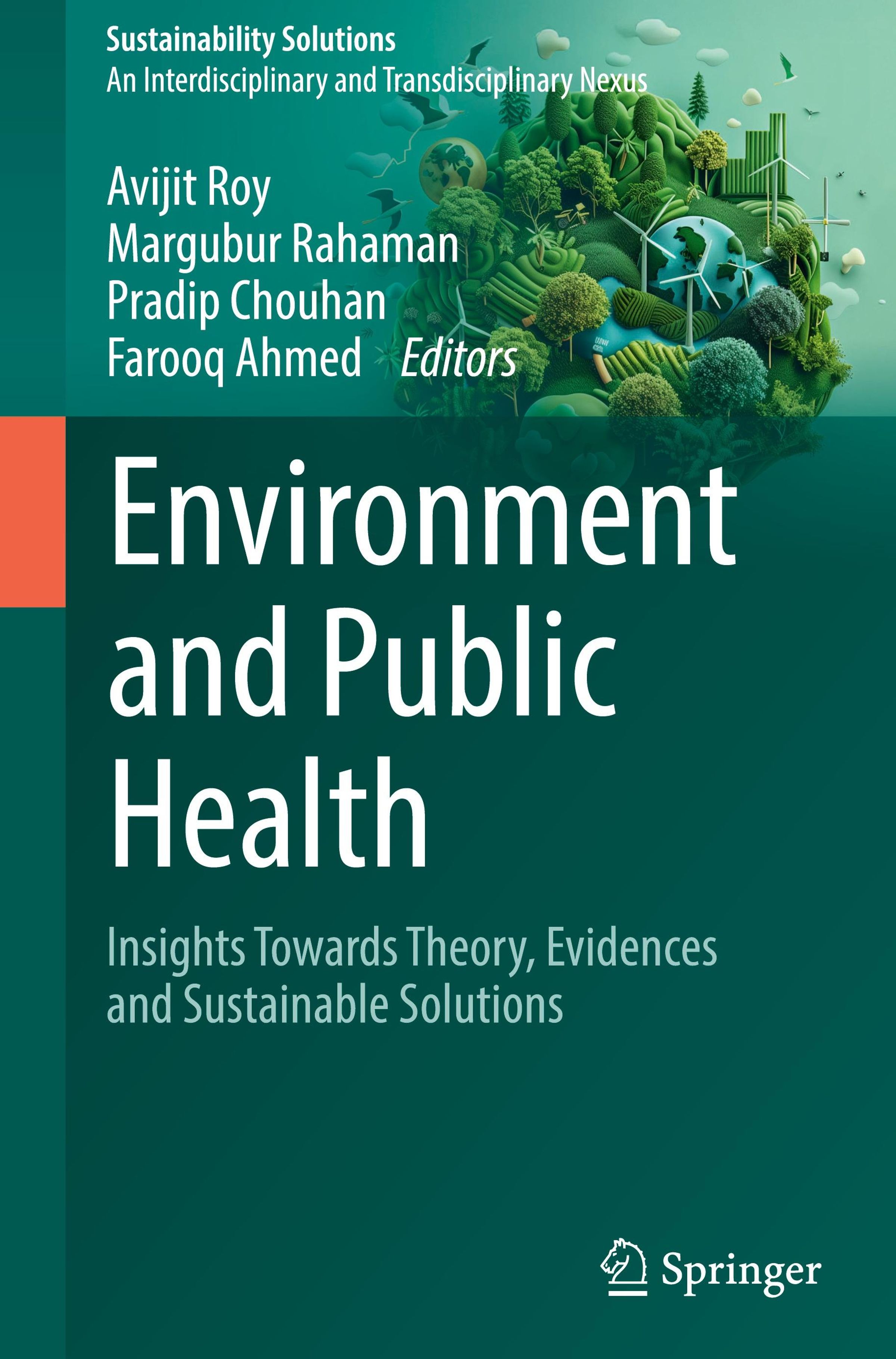 Buchtitel: "Environment and Public Health". Herausgeber: Avijit Roy, Margubur Rahaman, Pradip Chouhan, Farooq Ahmed. Hintergrund mit grüner, nachhaltiger Naturillustration. Verlag: Springer., Buch