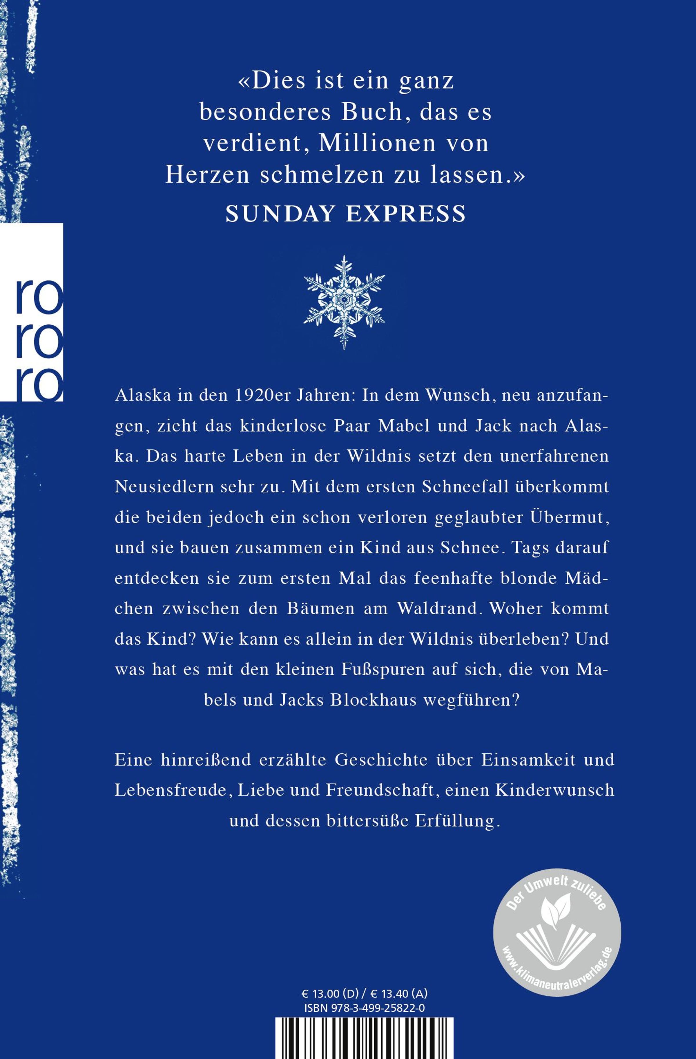 In dem Wunsch, neu anzufangen, zieht das kinderlose Paar Mabel und Jack in die raue Natur Alaskas. Doch das harte Leben in der Wildnis setzt den unerfahrenen Neusiedlern zu. Mit dem ersten Schneefall überkommt die beiden jedoch ein schon verloren geglaubter Übermut, und sie bauen zusammen ein Kind aus Schnee. Am nächsten Tag entdecken sie ein feenhaftes blondes Mädchen zwischen den Bäumen am Waldrand. Woher kommt das Kind? Wie kann es allein in der Wildnis überleben? Und was hat es mit den kleinen Fußspuren auf sich, die von Mabels und Jacks Blockhaus wegführen?