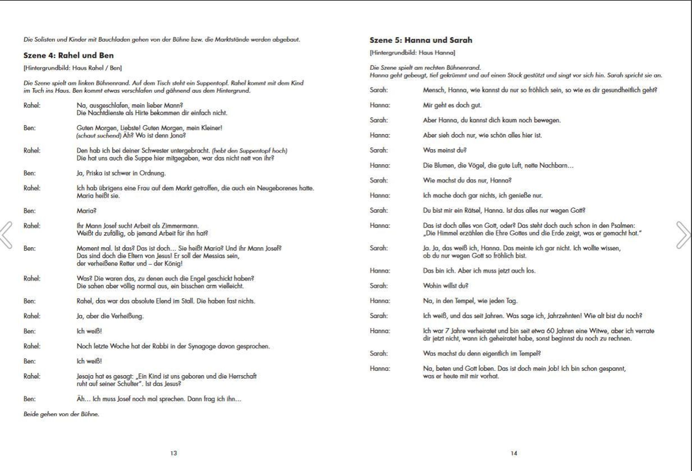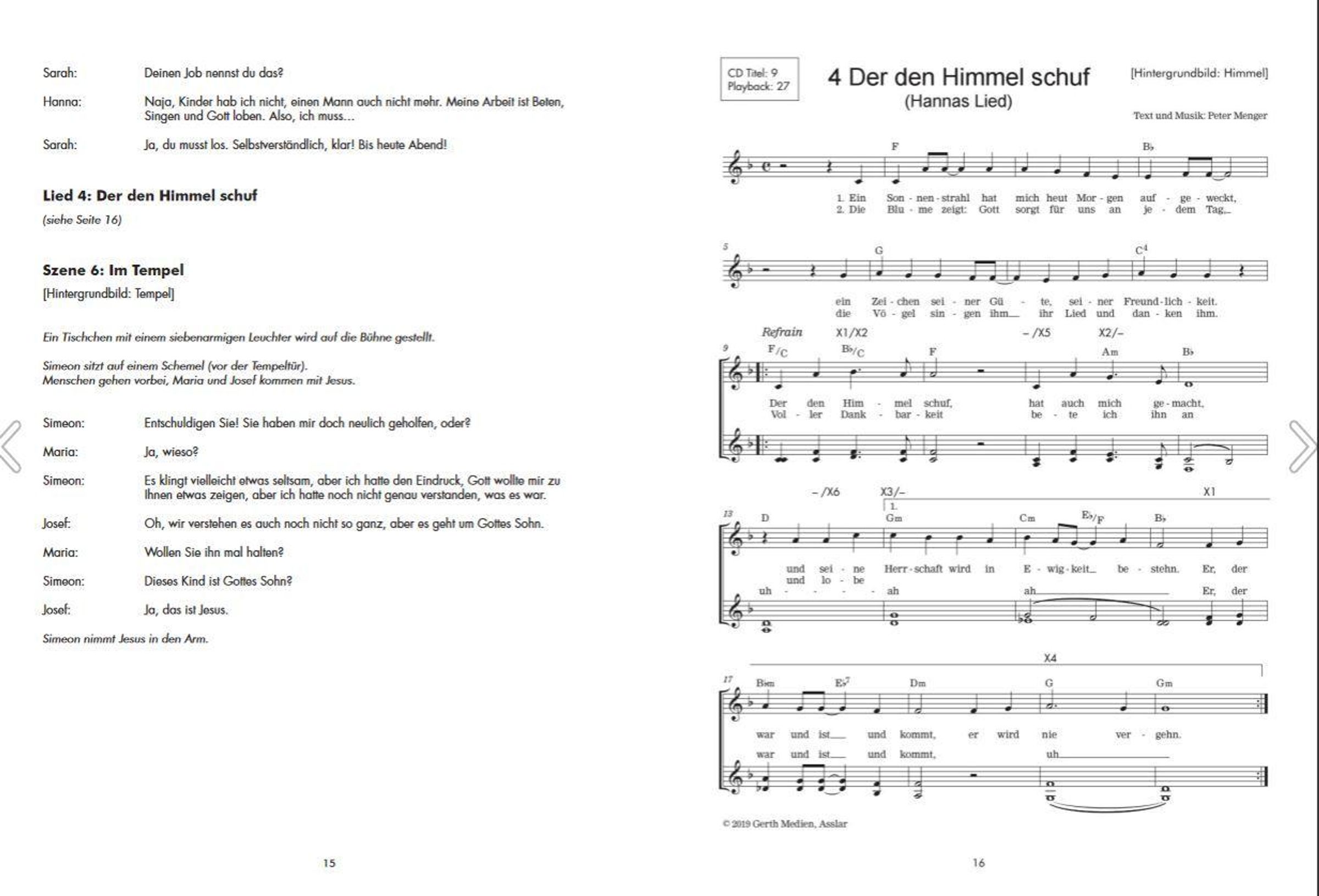 Text: "Kinder-Mini-Musical", "Er-wartet", "Peter Menger". Eine Illustration zeigt zwei Frauen mit einem Baby in einer Krippenszene., Buch