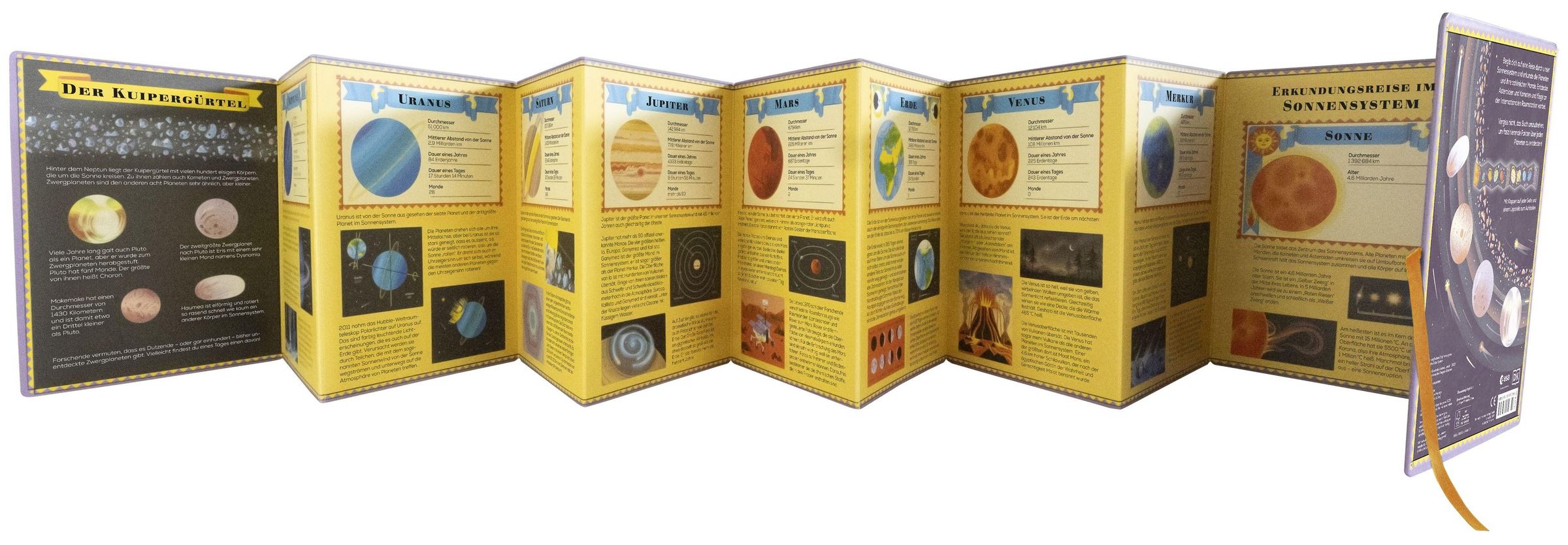Hinter stabilen Klappen warten faszinierende Fakten: Wie lange dauert ein Jahr auf dem Mars? Welchen Durchmesser hat der Jupiter? Und wie weit ist Uranus von der Sonne entfernt? Diesesaußergewöhnliche Klappenbuch nimmt Entdecker*innen ab 5 Jahren mit auf einespannende Reise durch die Weiten des Alls - von der Sonne, über den blauen Planeten Erde, vorbei an der ISS, bis zu den geheimnisvollen Rändern unseres Sonnensystems. Das2 Meter lange Leporello zeigt beeindruckende Weltraumbildern der Planeten, ihrer Monde, Asteroiden und Kometen. In Kooperation mit der ESA kindgerecht aufbereitet, vereint dieses illustrierte Wendebuch faszinierende Fakten, wunderschöne Illustrationen und interaktiven Entdeckerspaß.