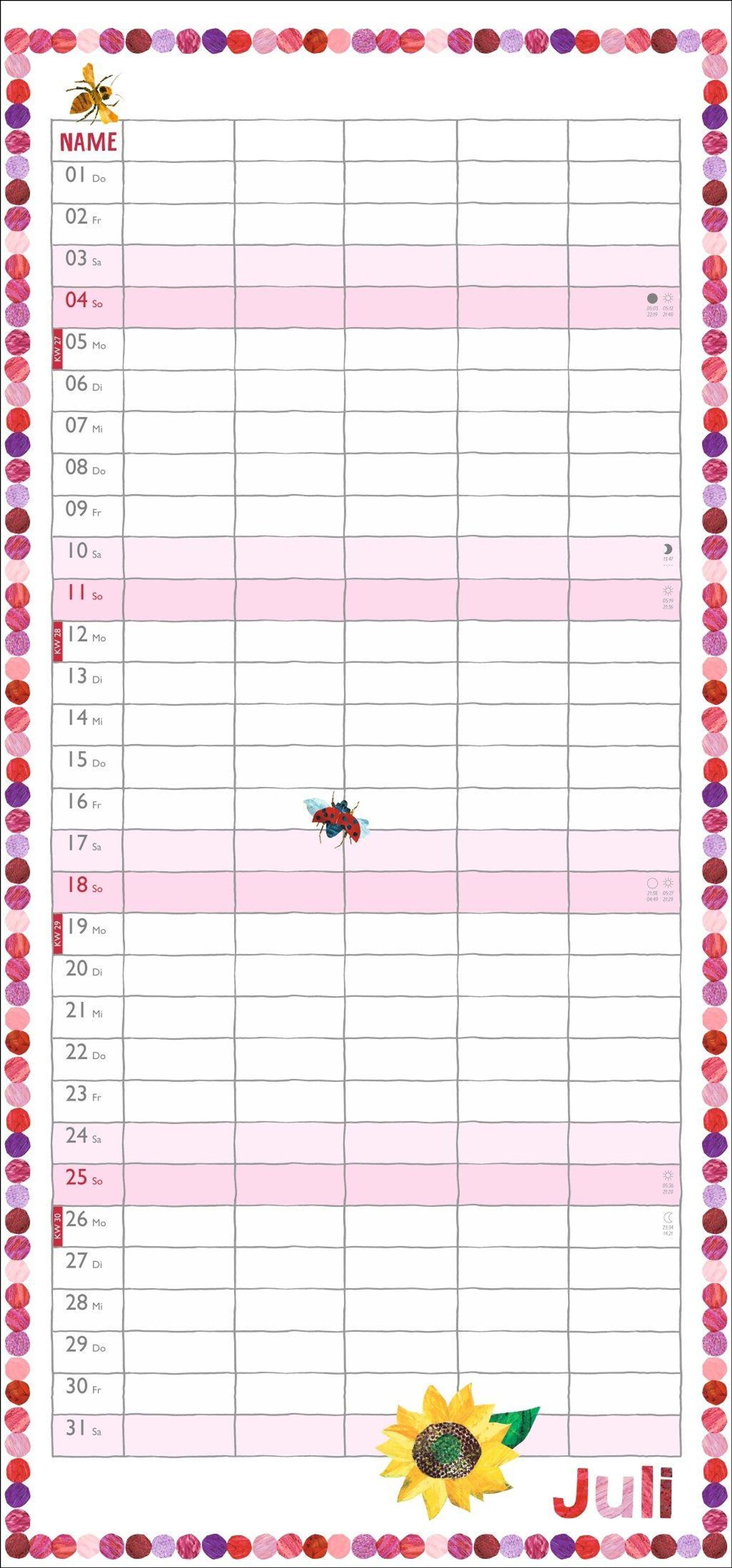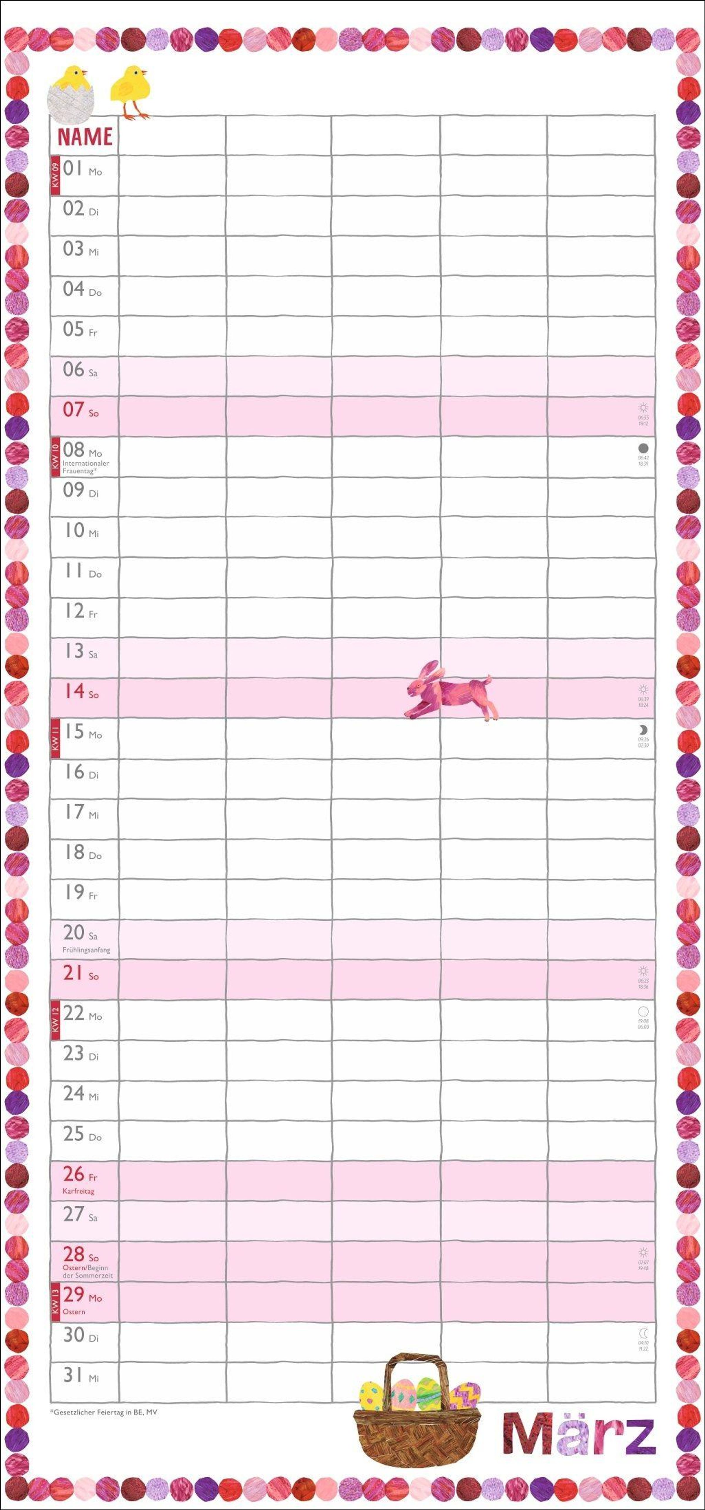 - Familienkalender mit 5 Spalten. Liebevoll illustrierter Wandkalender mit Schulferien und Stundenplänen.