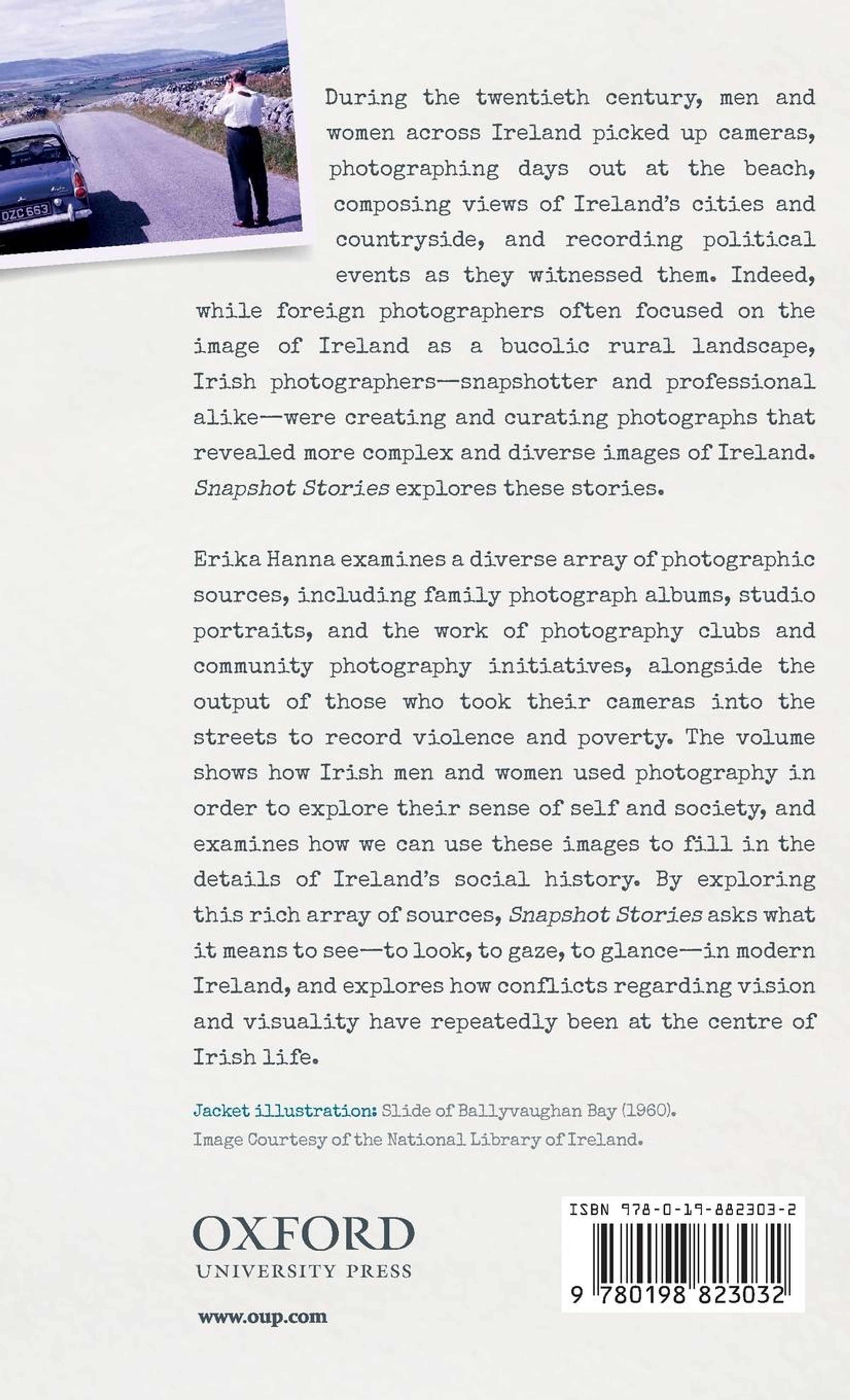 During the twentieth century, men and women across Ireland picked up cameras, photographing days out at the beach, composing views of Ireland's cities and countryside, and recording political events as they witnessed them. Indeed, while foreign photographers often still focused on the image of Ireland as bucolic rural landscape, Irish photographers-snapshotter and professional alike-were creating and curating photographs which revealed more complex and diverse images of Ireland. Snapshot Stories explores these stories. Erika Hanna examines a diverse array of photographic sources, including family photograph albums, studio portraits, the work of photography clubs and community photography initiatives, alongside the output of those who took their cameras into the streets to record violence and poverty. The volume shows how Irish men and women used photography in order to explore their sense of self and society and examines how we can use these images to fill in the details of Ireland's social history. By exploring this rich array of sources, Snapshot Stories asks what it means to see-to look, to gaze, to glance-in modern Ireland, and explores how conflicts regarding vision and visuality have repeatedly been at the centre of Irish life.