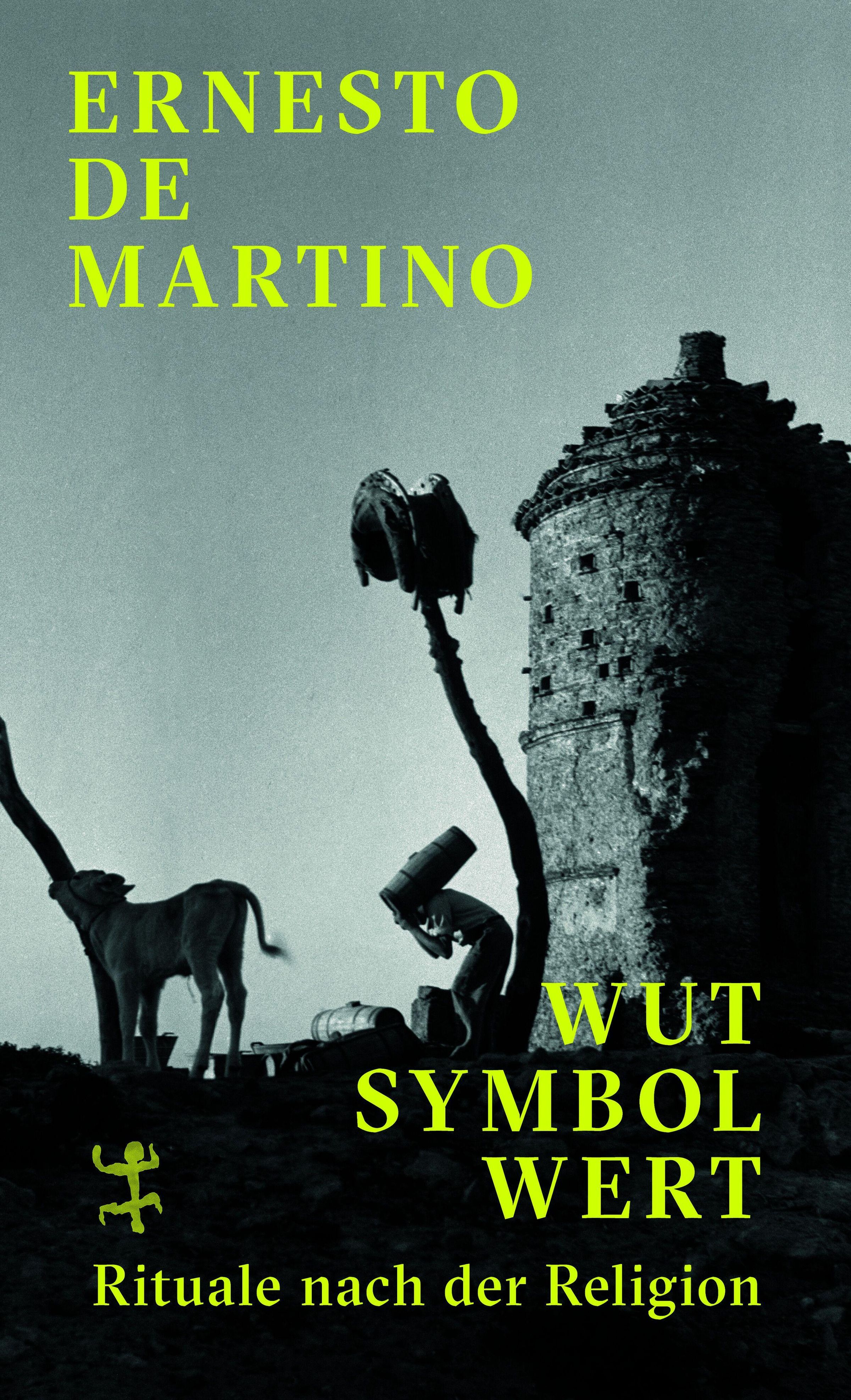 Oben groß "ERNESTO DE MARTINO". Unten "WUT SYMBOL WERT. Rituale nach der Religion". Schwarz-Weiß-Szene: Turm, Person mit Fass., Buch