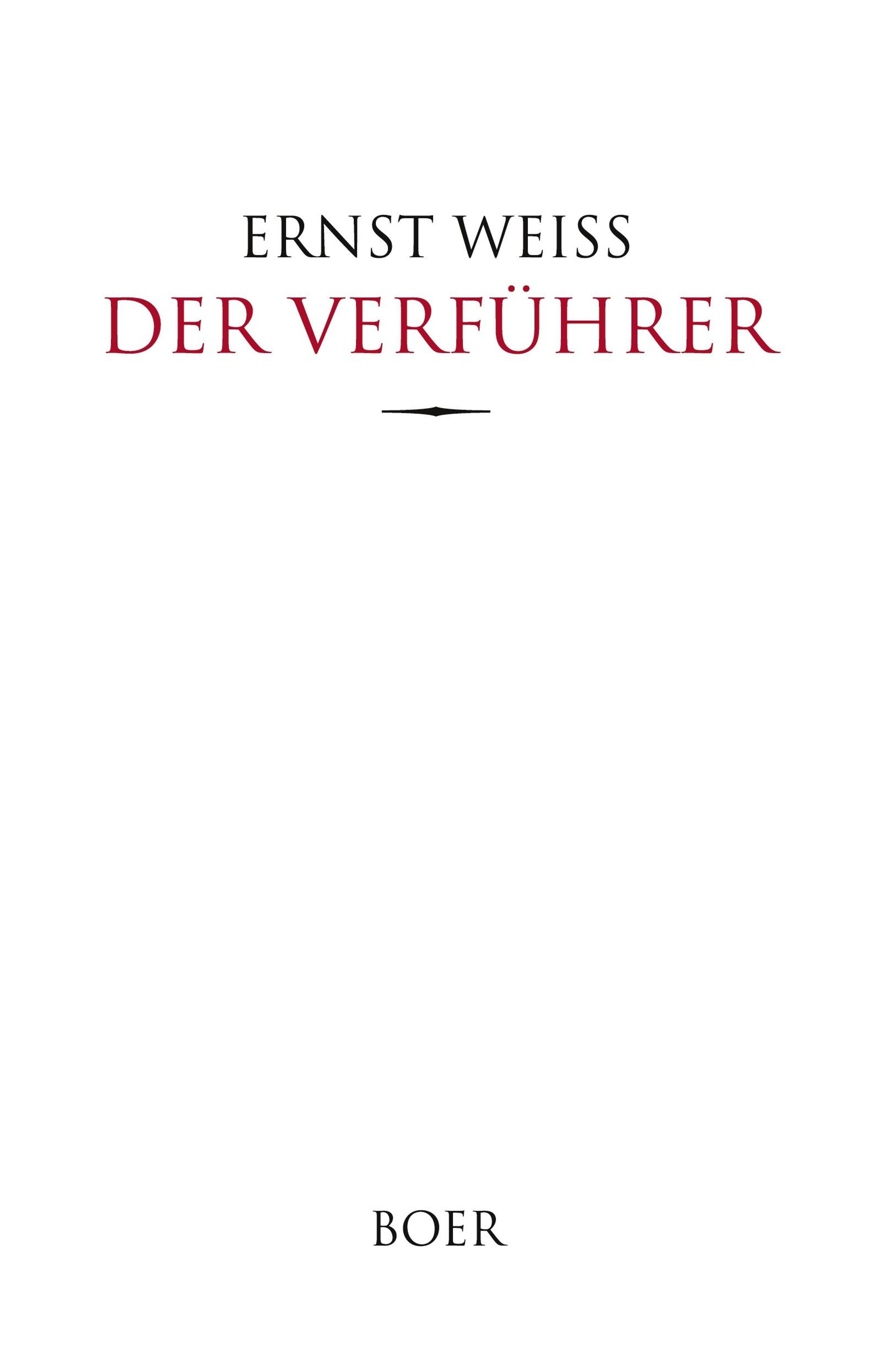 Text: "ERNST WEISS DER VERFÜHRER" in großen Lettern, darunter "BOER". Schlichtes Layout auf weißem Hintergrund., Buch