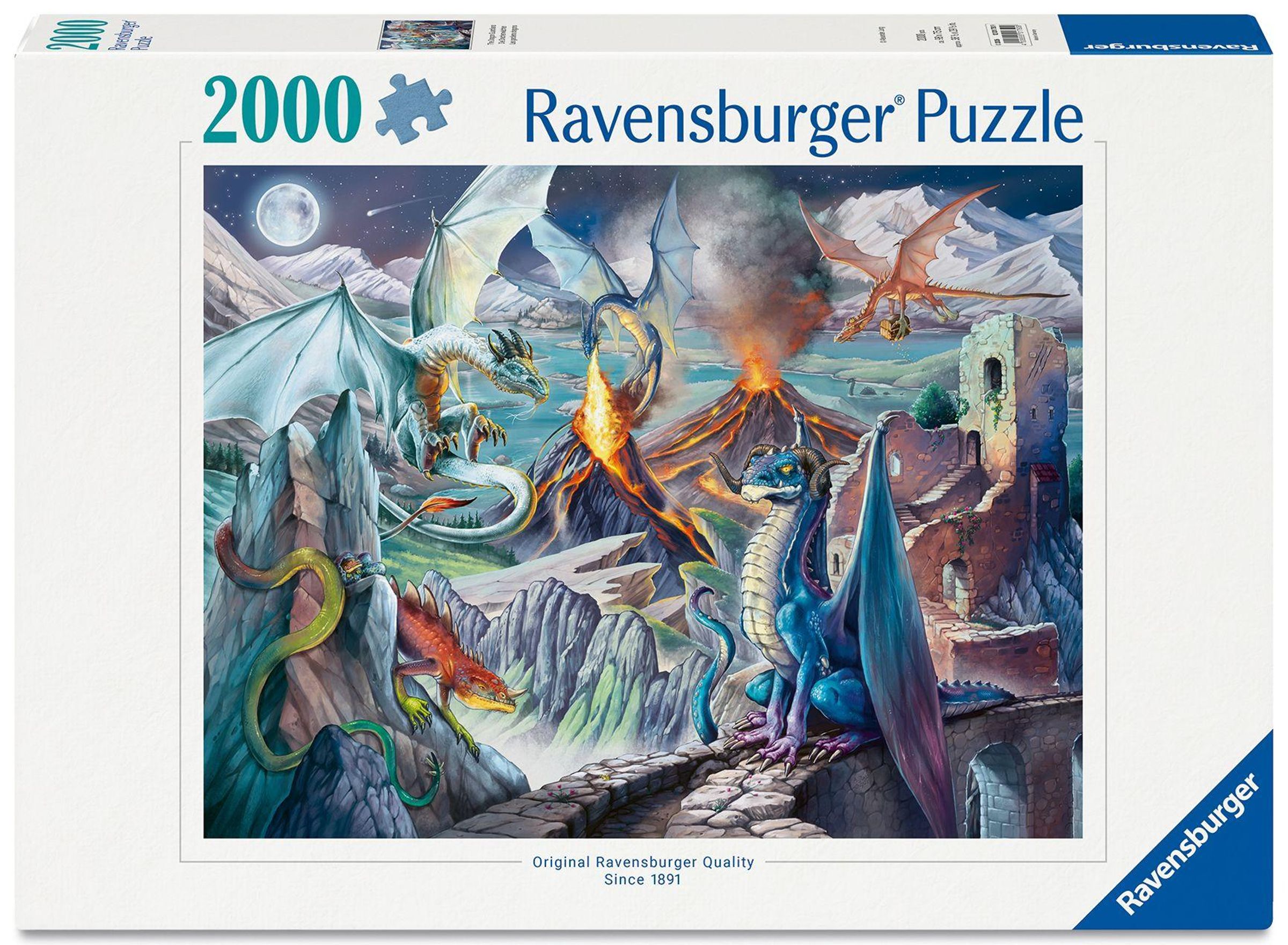 "2000 Ravensburger Puzzle" auf weißem Hintergrund, Drache und Vulkan in bunter Illustration., Spiele