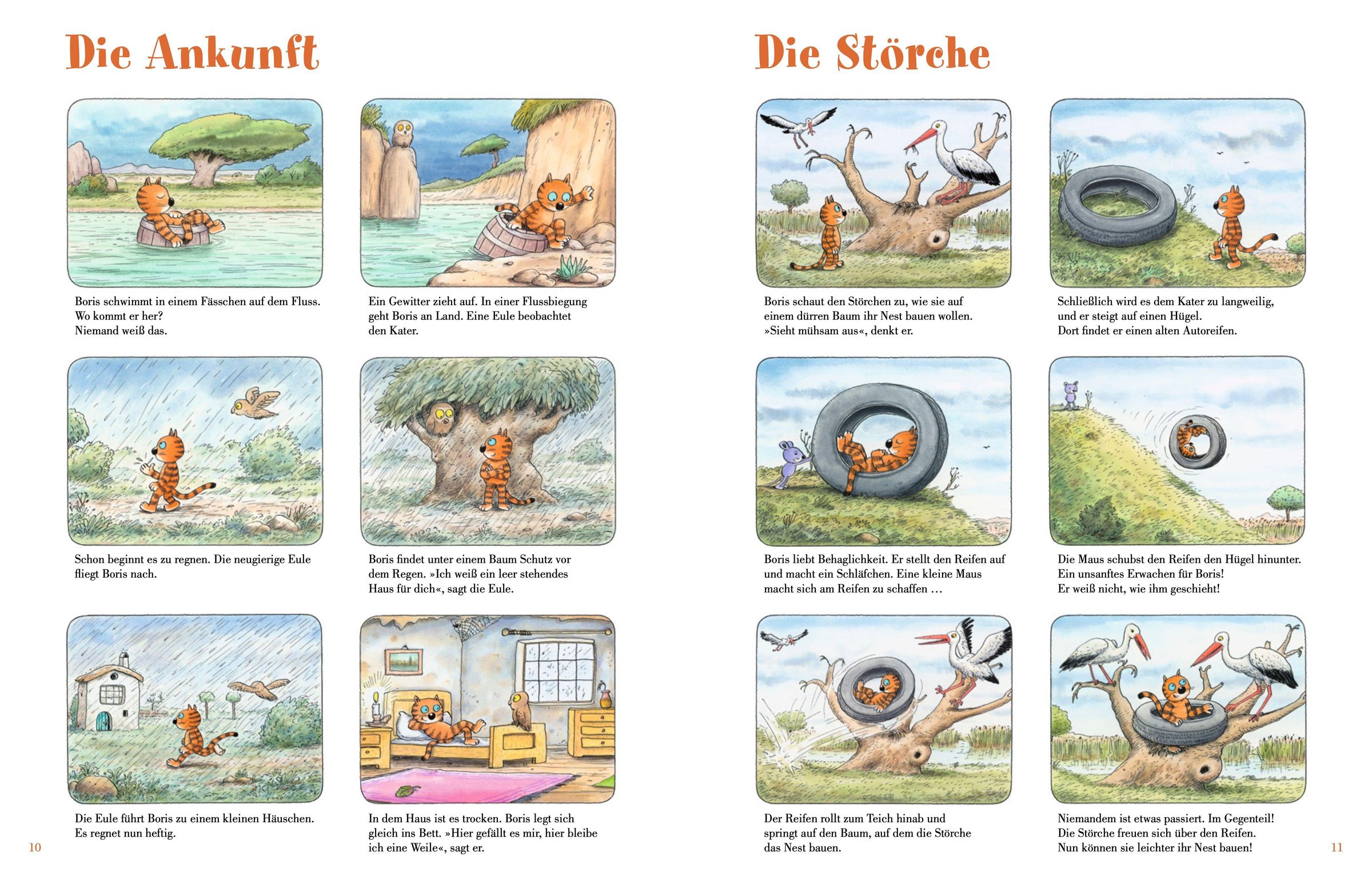 Boris der Kater und seine Freunde erleben so allerlei. Schon manch genialer Einfall von Boris war der Beginn eines großen Abenteuers. Wo auch immer es sie hinführt, helfen sich die Freunde gegenseitig aus der Patsche und greifen sich unter die Arme. Bei Boris gibt es für jedes Problem eine Lösung, und auf jeden Regenschauer folgt Sonnenschein.
