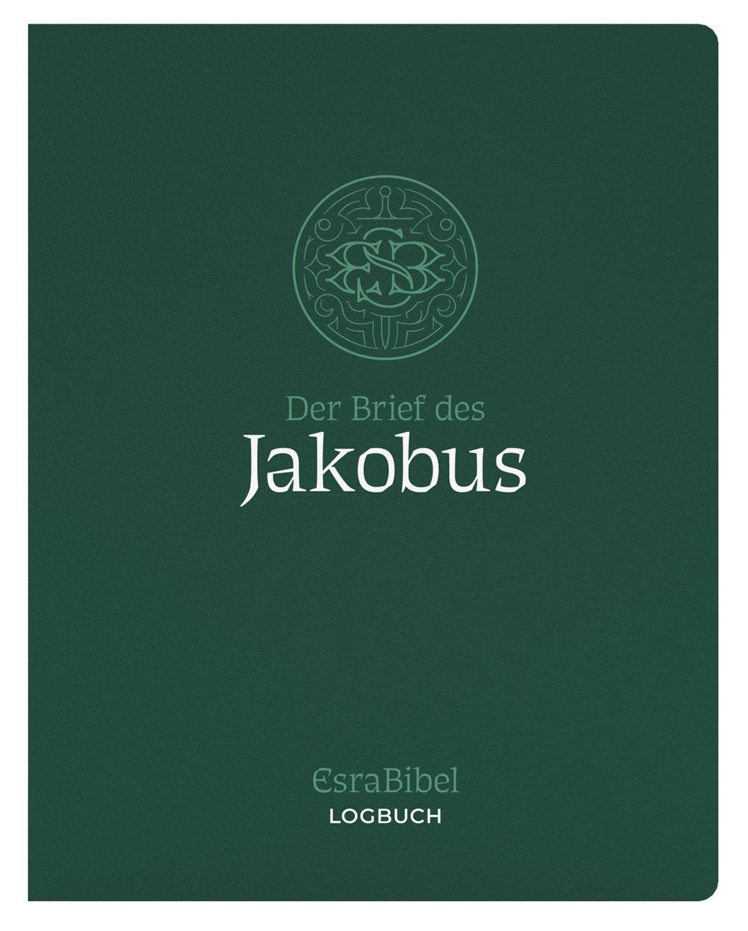 "Der Brief des Jakobus" steht im Zentrum, darunter "EsraBibel LOGBUCH". Ein kreisförmiges Logo mit Symbolen darüber., Buch