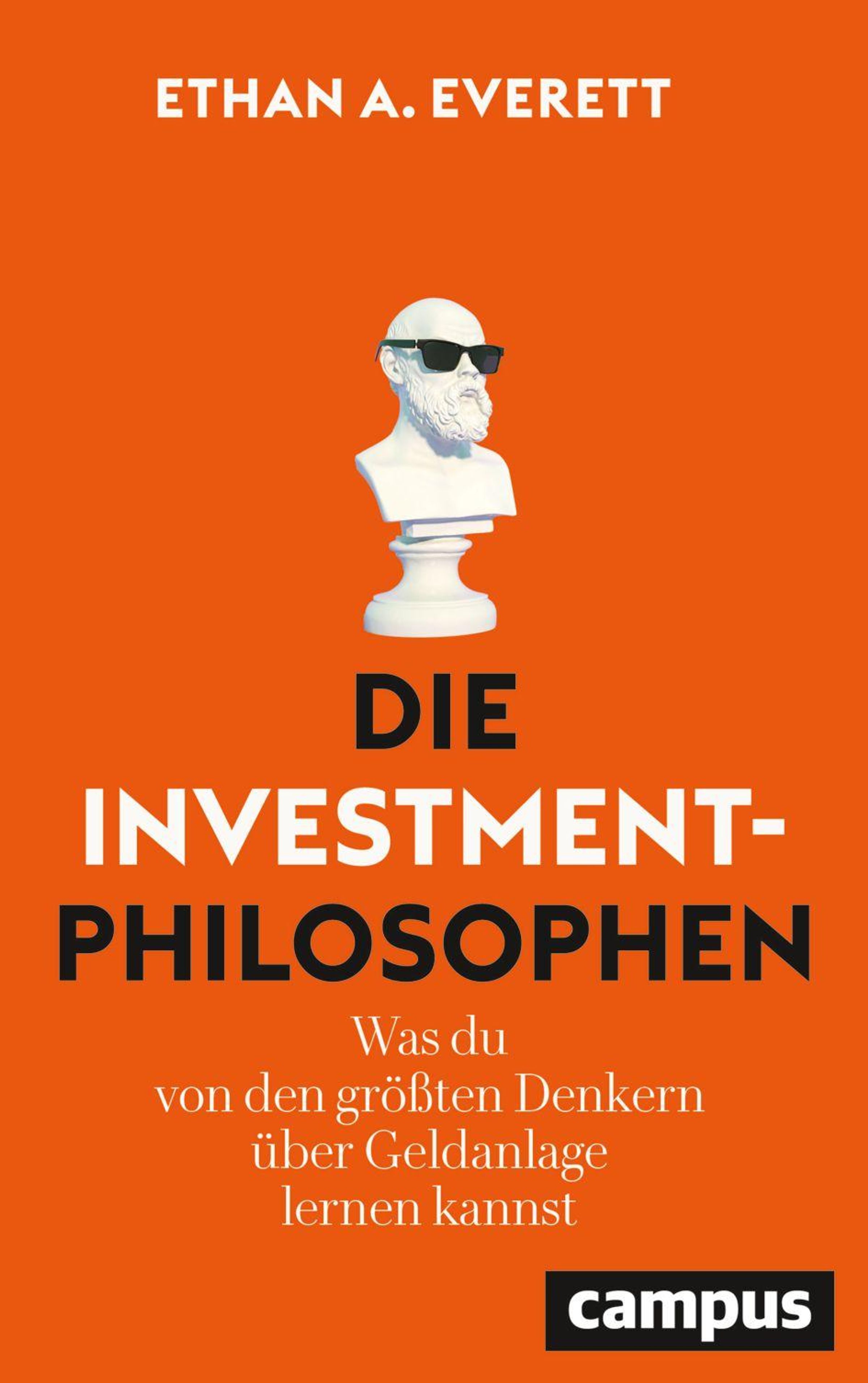 Titel: Die Investmentphilosophen. Untertitel: Was du von den größten Denkern über Geldanlage lernen kannst. Schriftzug oben: Ethan A. Everett. Unten ist ein Logo. Darunter eine Skulptur mit Sonnenbrille., Buch