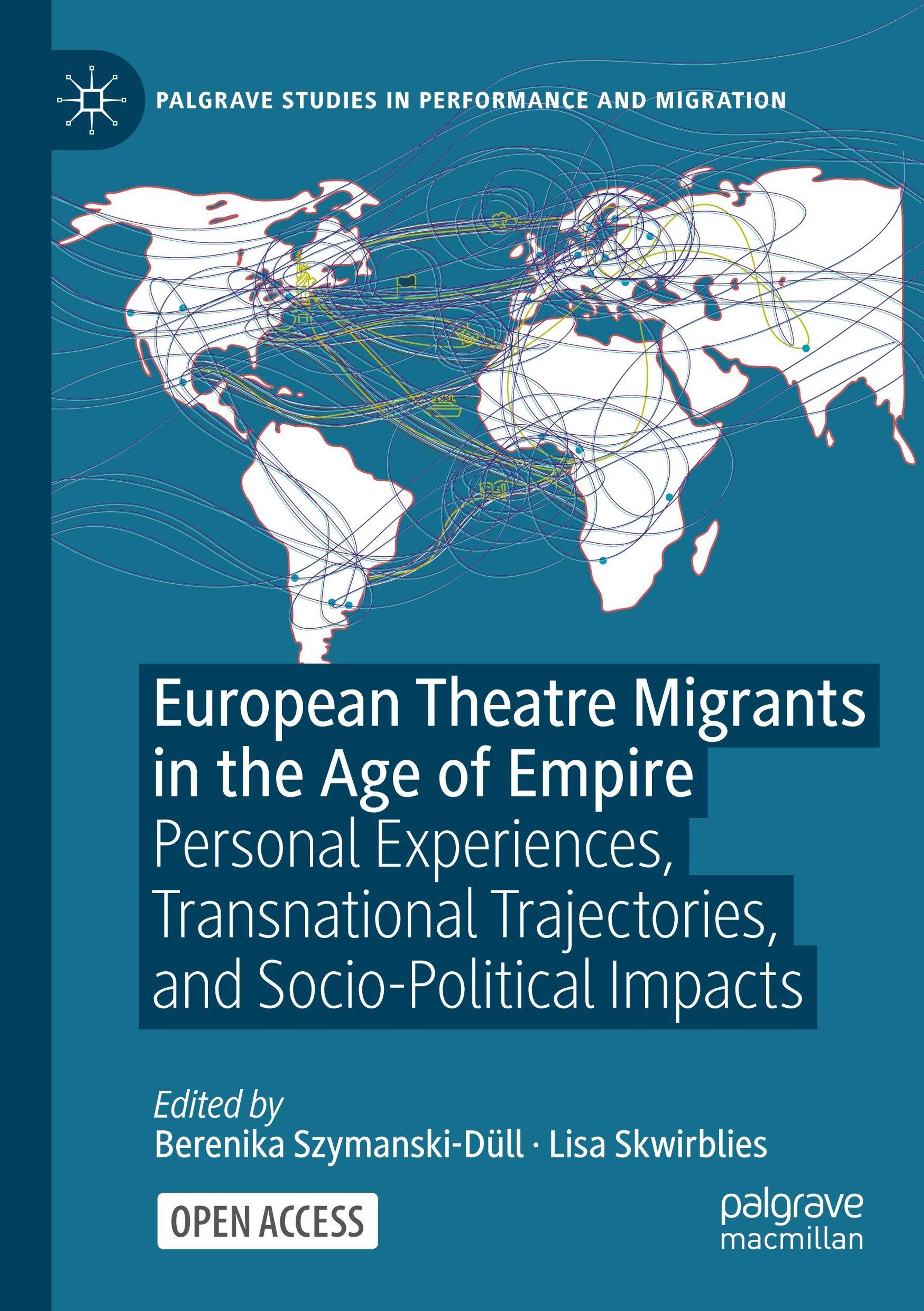 „European Theatre Migrants in the Age of Empire“. Weltkarte mit Verbindungslinien. Palgrave-Logo oben links., Buch