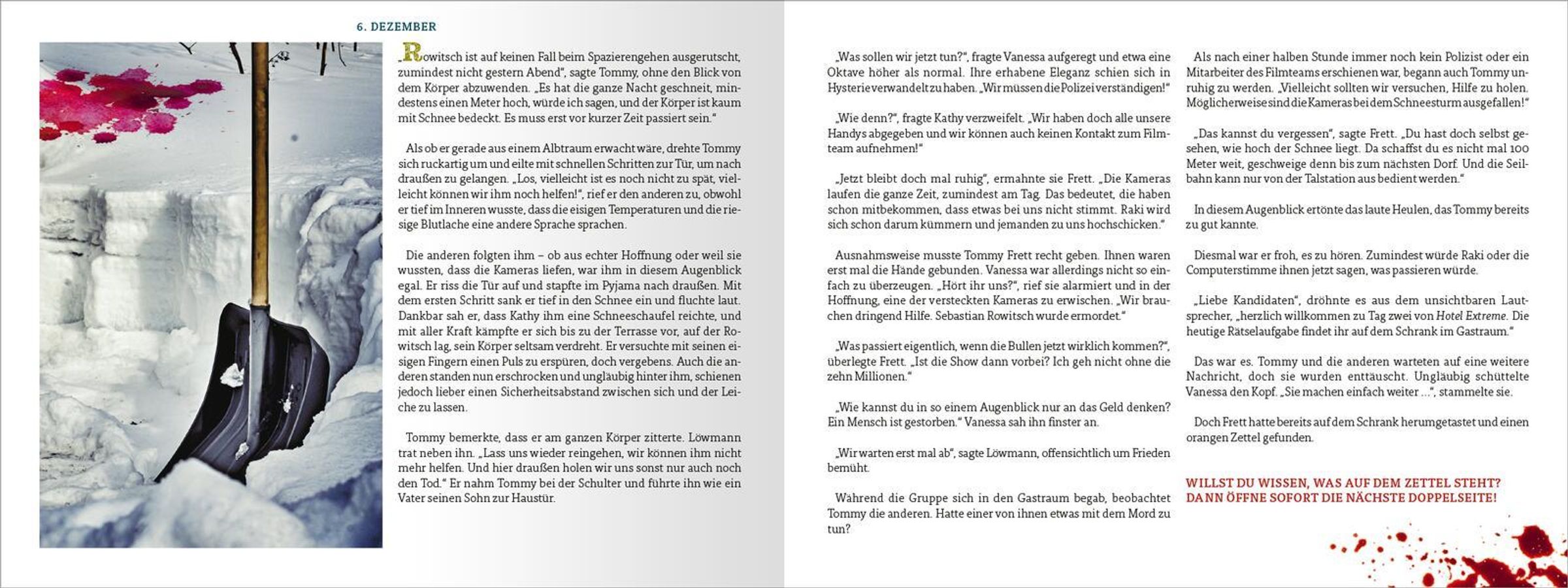 Ein verlassenes Hotel in den Bergen. Zehn Millionen Euro für den Sieger. Und ein Spiel um Leben und Tod. Die neue Weihnachts-Show "Hotel Extreme" verspricht echten Nervenkitzel: Sieben Teilnehmer werden 24 Tage rund um die Uhr von Kameras beobachtet. Sie haben keinen Kontakt zur Außenwelt, und Essen können sie sich nur mit gelösten Rätseln erspielen. Doch bald liegt der erste Kandidat tot unter dem Christbaum und schnell wird klar, wie hoch der Einsatz wirklich ist. Wer gibt auf und verzichtet auf die zehn Millionen und wer ist bereit, sein Leben zu riskieren? Gehört der Mord wirklich zur Show oder hat längst ein Unbekannter das Ruder übernommen, der einen völlig anderen Plan verfolgt?
