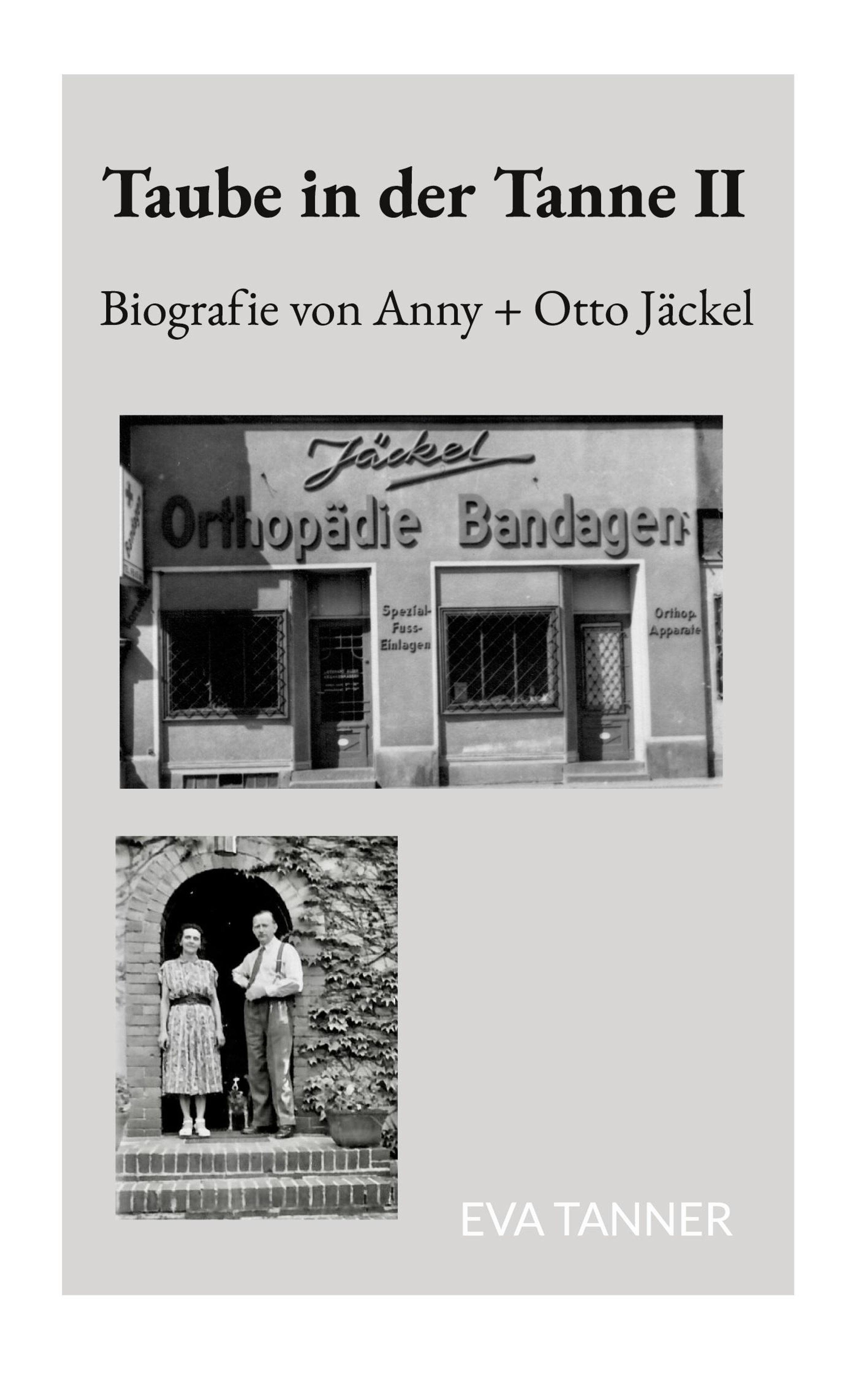 "Taube in der Tanne II. Biografie von Anny + Otto Jäckel, Eva Tanner." Foto eines Geschäfts und ein Paar vor einer Haustür., Buch