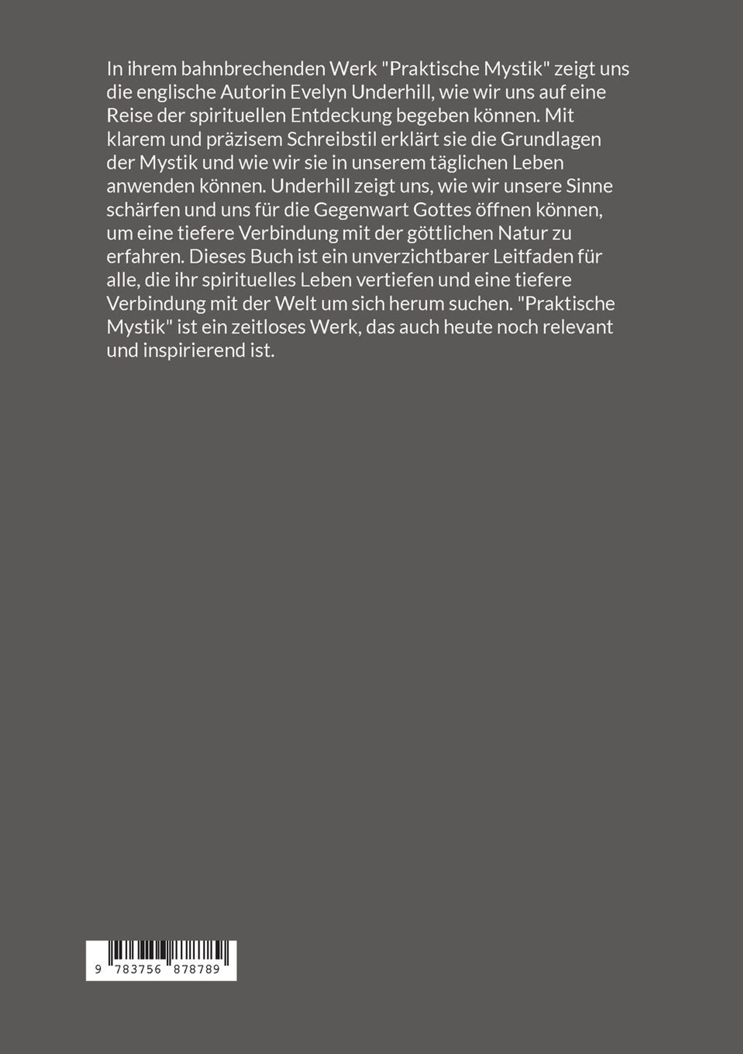 In ihrem bahnbrechenden Werk "Praktische Mystik" zeigt uns die englische Autorin Evelyn Underhill, wie wir uns auf eine Reise der spirituellen Entdeckung begeben können. Mit klarem und präzisem Schreibstil erklärt sie die Grundlagen der Mystik und wie wir sie in unserem täglichen Leben anwenden können. Underhill zeigt uns, wie wir unsere Sinne schärfen und uns für die Gegenwart Gottes öffnen können, um eine tiefere Verbindung mit der göttlichen Natur zu erfahren. Dieses Buch ist ein unverzichtbarer Leitfaden für alle, die ihr spirituelles Leben vertiefen und eine tiefere Verbindung mit der Welt um sich herum suchen. "Praktische Mystik" ist ein zeitloses Werk, das auch heute noch relevant und inspirierend ist.