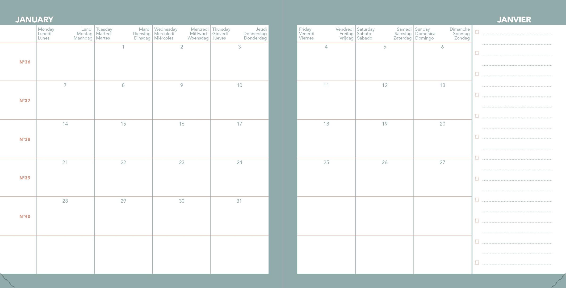 Farbiger Wochenkalender mit einer Woche auf 2 Seiten für eine gute Übersicht über die gesamte Woche. Enthält eine monatliche Doppelseite am Anfang jedes Monats, um einen Überblick über bevorstehende Ereignisse zu erhalten Weißes Clairefontaine-Papier, für ein einzigartiges Schreiberlebnis. Abtrennbare perforierte Ecken für eine schnelle und einfache Or ientierung. Abnehmbarer Einband und nachfüllbarer Innenteil für eine lange Nutzung. Aufbewahrungstaschen für kleine Dokumente.