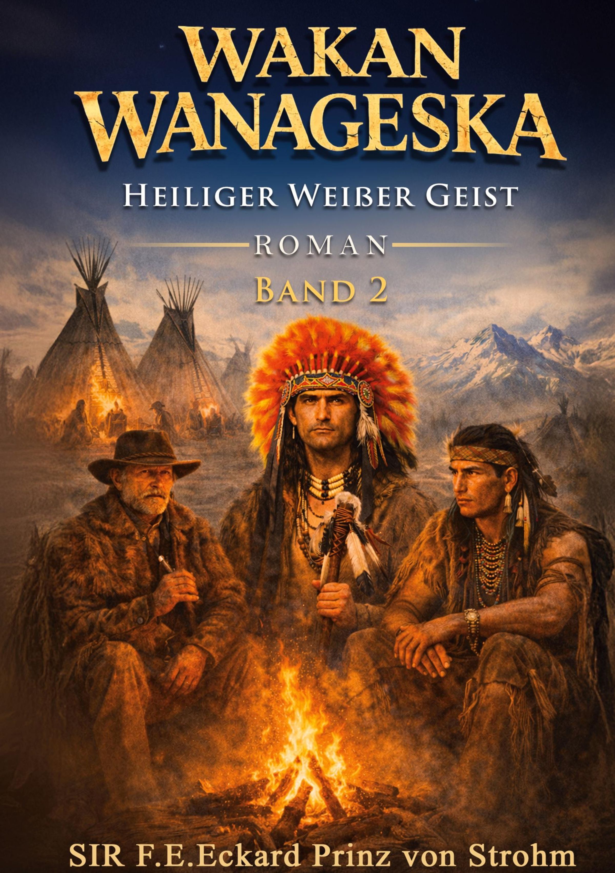 "Wakan Wanageska - Heiliger Weiber Geist. Roman Band 2." Drei Personen in Stammeskleidung um ein Feuer, Tipis im Hintergrund., Buch